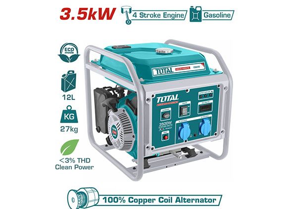 Бензиновый генератор 3500 ВТ TOTAL TP340001 Предназначен для оперативного снабжения электроэнергией.Оснащен системой ручного запуска (ключ).Мощность: 3500 Вт. Система охлаждения: 220-240V. Топливный бак: 12 литров. Упакован в картонную коробку. Вес: 46 кг. Мощность цилиндра: 21 л. Гарантия: 2 года.