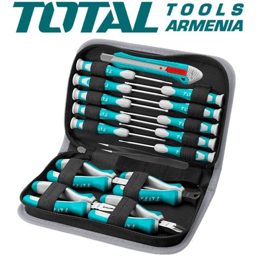 Набор инструментов 16 шт. TOTAL TKTTSK0162 1 шт. Комбинированные плоскогубцы, 4,5 дюйма 1 шт. Плоскогубцы с длинными губками, 4,5 дюйма 1 шт. Диагональные кусачки, 4,5 дюйма 1 шт. Плоскогубцы для обрезки крайов, 4,5 дюйма 10 прецизионных отверток, SL1.5 x 50, SL2.0 x 50, SL2.5 x 50, SL3.0 x 50, PH0 x 50, PH00 x 50, PH000 x 50, T6 x 50, T8 x 50, T10 х 50 1 шт. Пинцет, 125 мм 1шт выдвижной нож