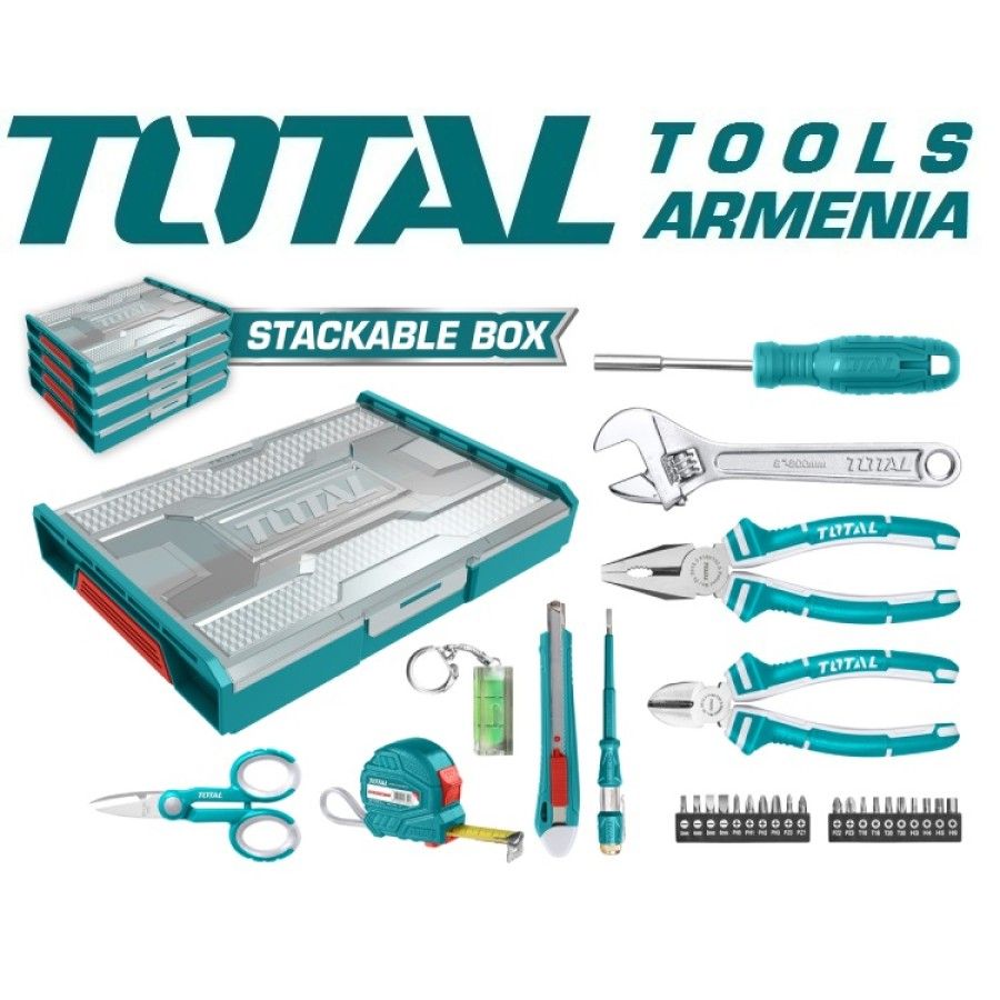 Набор бытовых инструментов из 29 предметов TOTAL THKTV02H291 Материал корпуса ПП Размеры 340x250x60мм В комплекте 29шт. 1 шт. Стальная измерительная лента, 3м x 16мм 1 шт. Кусачки диагональные, 6 ″ Плоскогубцы комбинированные, 1 шт., 7 ″ 1 шт. Разводной ключ, 8 ″ 1 шт. Тестовый карандаш, 190 мм 1 шт. Нож с отламывающимся лезвием 1 шт. Ножницы, 5.5 ″ 1 шт. Малый уровень Магнитный стержень, 100 мм - 1 шт. 20 бит отверток: SL3, SL4, SL5, SL6, PH0, PH1, PH2, PH3, PZ0, PZ1, PZ2, PZ3, T10, T15, T20, T30, H3, H4, H5, H6 Упакован в пластиковый кейс