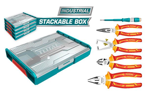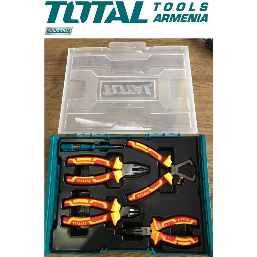 Набор диэлектрических инструментов до 1000В 5шт TOTAL THKTV02P051 1шт - изолированные длинногубцы 160мм (6 дюймов) 1шт - изолированные диагональные кусачки 160 (6 дюймов) 1шт - изолированные плоскогубцы 180мм (7дюймов) 1шт - Диэлектрические Клещи Для Снятия Изоляции 160 мм (6 дюймов ) 1шт - тестовый карандаш 140мм Упаковано в пластиковую коробку