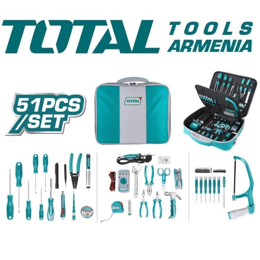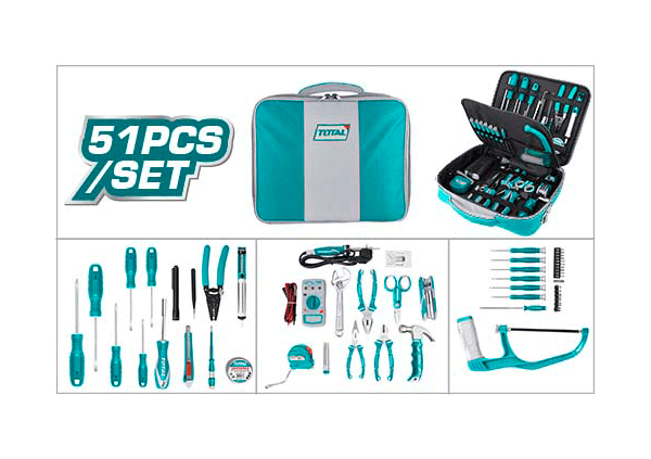 Набор инструментов 51 шт. TOTAL TKTTSK0512 3 отвертки Phillips: PH0 x 75 мм, PH1 x 100 мм, PH2 x 150 мм 3 шлицевые отвертки: SL3 x 75 мм, SL5 x 100 мм, SL6 x 150 мм 6 отверток для точной механики: SL2 x 50 мм, SL2,5 x 50 мм, SL3 x 50 мм, PH000 x 50 мм, PH00 * 50 мм, PH0 * 50 мм Набор шестигранных ключей (8 размеров), 2-8 мм, 1 шт. 10 бит отверток: H4 мм, H5 мм, T20, T25, SL4, SL6, PH1, PH2, PZ1, PZ2 Магнитный стержень, 100 мм - 1 шт. 1 шт. Стальная измерительная лента, 3м x 16мм 1 шт. Мини-молоток 1 шт. Тестовый карандаш, 190 мм 1 шт. Длинногубцы, 6 дюймов 1 шт. Диагональные кусачки, 6 дюймов 1 шт. Плоскогубцы, 7 дюймов 1 шт. Разводной ключ, 8 дюймов 1 шт. Нож с отламывающимся лезвием 1 шт. Напильник стальной полукруглый, 3 x 140 мм Пинцет, 125 мм, 1 шт. 1 шт. Ножницы, 5,5 дюйма 1 шт. Изолента ПВХ, 18мм х 9,15м Клещи для зачистки проводов, 6 дюймов, 1 шт. 1 шт. Фонарик 6 шестигранных головок 1/4 дюйма: 5 мм, 6 мм, 8 мм, 9 мм, 10 мм, 11 мм 1 шт. Адаптер шестигранный, от 4 мм до 6 мм 1 шт. Рама для мини-ножовки, 6 дюймов 1 шт. Цифровой мультиметр 1 шт. Паяльник, 40Вт 1 шт. Подставка / держатель для паяльника 1 шт. Припой, 10 г 1 шт. Демонтажный насос