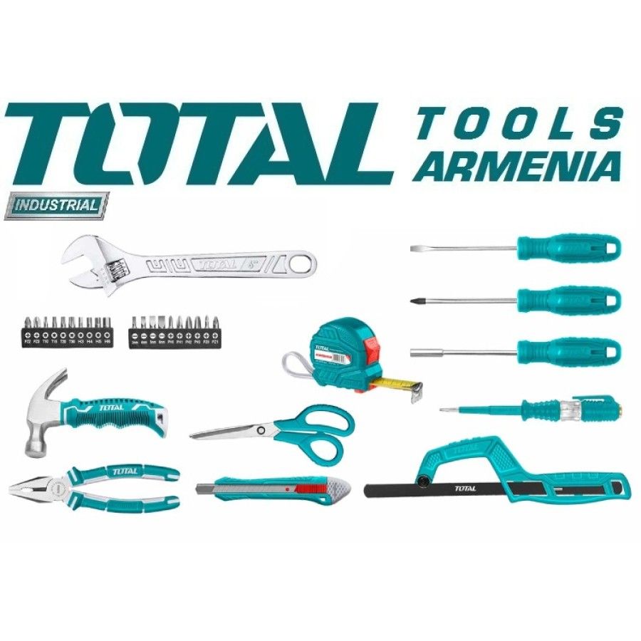 Набор инструментов из 32 предметов TOTAL THKTHP20326 1 шт. 1/4″ магнитный держатель бит 1 шт. молоток для гвоздей 1 шт. Комбинированные плоскогубцы, 7″ 1 шт. Шлицевая отвертка, SL5,5 x 100 мм 1 отвертка Phillips, PH1 x 100 мм 1 шт тестовый карандаш 1 шт. 3 м измерительная лента 1 шт выдвижной нож 1 шт ножницы, 8" 1 шт мини-ножовка 20 бит 1/4": SL3, SL4, SL5, SL6, PH0, PH1, PH2, PH3, PZ0, PZ1, PZ2, PZ3, T10, T15, T20, T30, H3, H4, H5, H6 1 шт пластиковая коробка, 17" Вес 2,9 кг