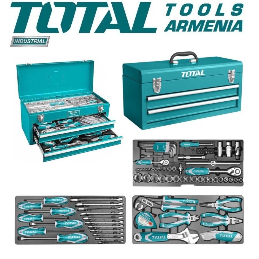Набор инструментов в ящике 97 предметов TOTALTHPTCS70971 Первый шкафчик: 19 шт., 8 отверток: SL3x75 мм, 4x100 мм, 5x125 мм, 6x100 мм, 8x200 мм, PH1x80 мм, PH2x100 мм, PH3x200 мм Комбинированные ключи, 11 шт .: 6 мм, 7 мм, 8 мм, 9 мм, 10 мм, 11 мм, 12 мм, 13 мм, 14 мм, 15 мм, 17 мм Второй шкафчик: 7 шт., 1 шт. Плоскогубцы комбинированные, 8 ″ 1 шт. Длинногубцы, 6 ″ 1 шт. Клещи для диагональной резки, 7 ″ Отвертка шлицевая, 1 шт., 10 ″ 1 шт. Клещи для насосов, 10 ″ 1 шт. Стальная измерительная лента, 3м x 16мм 1 шт. Универсальный нож Верхний шкафчик: 70 шт., 20 бит отверток: SL3, SL4, SL5, SL6, PH0, PH1, PH2, PH3, PZ0, PZ1, PZ2, PZ3, T10, T15, T20, T30, H3, H4, H5, H6 18 шестигранных головок 1/2 ″: 8 мм, 10 мм, 12 мм, 13 мм, 14 мм, 15 мм, 16 мм, 17 мм, 18 мм, 19 мм, 20 мм, 21 мм, 22 мм, 23 мм, 24 мм, 27 мм, 30 мм, 32 мм 13 шестигранных головок 1/4 ″: 4 мм, 4,5 мм, 5 мм, 5,5 мм, 6 мм, 7 мм, 8 мм, 9 мм, 10 мм, 11 мм, 12 мм, 13 мм, 14 мм 1 шт. 1/2 ″ ключ с трещоткой (45 зуб.) 1 шт. 1/4 ″ ключ с трещоткой (45 зуб.) 1 шт. 1/4 ″ вращающаяся ручка 2 удлинителя 1/2 ″: 125 мм (5 ″), 250 мм (10 ″) 2 шт. Свечи зажигания 1/2 ″: 16 мм и 21 мм 1 шт. 1/2 ″ Универсальный шарнир 1 шт. 1/4 ″ Универсальный шарнир 1 шт. Гибкая ручка 1/2 ″, 375 мм 9 шестигранных ключей 1,5 мм, 2 мм, 2,5 мм, 3 мм, 4 мм, 5 мм, 6 мм, 8 мм, 10 мм Металлический ящик. Набор инструментов в ящике 97 предметов TOTAL THPTCS70971 пригодится для выполнения ремонтных и монтажных работ. Изделия отличаются прочностью, выдерживают иненсивные нагрузки, удобны в использовании. Комплект поставляется в раскладном металлическом кейсе, обеспечивающем компактное аккуратное хранение и транспортировку инструментов.