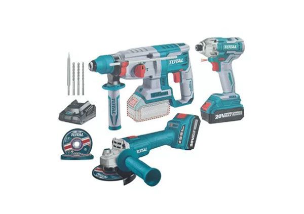 Набор литий-ионных инструментов 20 В, 3 предмета TOTAL TOSLI2301515 Перфоратор: TRHLI20228 Напряжение:20 В. Скорость без нагрузки:0 - 1100 об/мин. Частота ударов:0 - 5000 ударов в минуту. Сила удара:2,0 Дж. Максимальная глубина сверления в бетоне:26 мм. Встроенный рабочий свет. С системой патрона SDS plus. 3 сверлом,1 долотом. Ударный Винтоверт TIRLI2017 Напряжение:20 В. Бесщеточный двигатель Монтажное отверстие: шестигранник 6,35 Частота вращения:0-1300/0-2300 об/мин. Частота ударов:0-2000/0-3300 в/мин. Максимальная мощность:170 Нм. Устройство оснащено светодиодной подсветкой для освещения рабочей зоны. Угловая шлифовальная машина: TAGLI20157 Бесщеточный двигатель . Напряжение:20 В. Скорость вращения:3000 - 9000 об/мин. Диаметр диска:115 мм. Монтажное отверстие:M14. 1 шт. с отрезным диском по металлу, 2 шт. с аккумулятором 4,0 Ач,1 шт. с зарядным устройством. Упакован в красочную коробку.