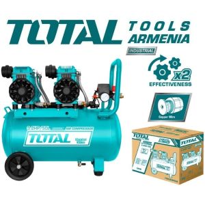 Тихий безмасляный воздушный компрессор 50 л 2400Вт TOTALTCS2240508 / ПРОМЫШЛЕННАЯ / INDUSTRIAL Тип - Тихий безмасляный воздушный компрессор . Тип компрессора - Безмасляная система . Напряжение - 220-240В. Частота - 50 Гц. Входная мощность - 2 x 1200 Вт. Число оборотов - 2850 об / мин. Объем бака - 50 л (13.2 галлона). Рабочее давление - макс. 8 бар (116 фунтов на кв. Дюйм). Производительность на входе - 220 л / мин.Производительность на входе - 212 л / минпри7 баре . Шум - 75 дБ. С ресивером; Легко перемещать; Удобный слив конденсата; Длительный срок службы. Транспортировочные колеса - 2 шт . Манометр - есть. Двигатель из медной проволоки и Двигатель с низким уровнем шума. Упаковано в картонную коробку . Тихий безмасляный воздушный компрессор TOTALTCS2240508 обладает высокой производительностью за счет прямого привода. Прочный корпус подходит для любых условий использования. Наличие колес и ручки для транспортировки обеспечивает мобильность, подходящую для строительных площадок или промышленных корпусов. Встроенный манометр позволяет легко контролировать степень сжатия воздуха и снижает вероятность поломки подключенного инструмента.