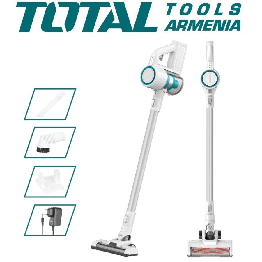 Аккумуляторный пылесос Li-ion 22.2V TOTALTVCH14111 Напряжение заряда - 240 В - 50/60 Гц. Напряжение - LI-ion 22,2В. Время зарядки - 4 - 5ч. Мощность - 140Вт. Емкость - 0,8л. Давление вакуума (кПа) - 10 кПа. Вес - 1,2 кг. Время работы - 35мин на малой скорости. Время работы - 20 минут на высокой скорости. Размер изделия - 230х220х1090мм. Упаковано в картонную коробку.