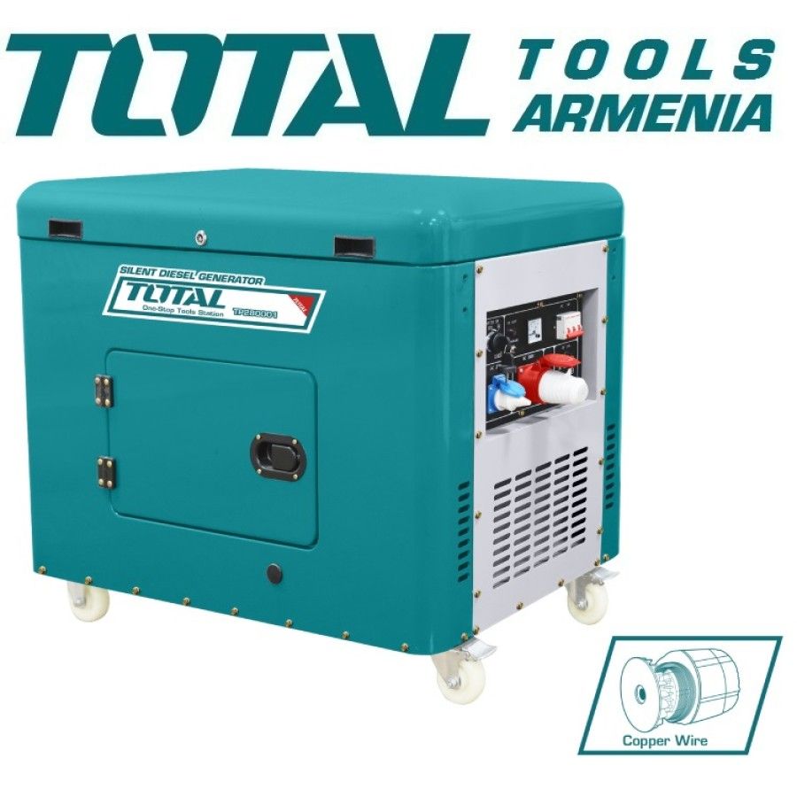 Дизель-генератор (стартер) Бесшумный Total TP280001 8000 Вт Генераторы дизельные TP280001,конструкция устройства элегантность, простота в эксплуатации и высокая долговечность при весе236 кг,включая колеса и ручное тяговое усилие, помогают легко перемещаться и удобно использовать в семье, на заводе. Удобная для пользователя полная панель управления. Автоматический выключатель переменного тока. Система AVR обеспечивает точный контроль напряжения. Не требующий обслуживания аккумулятор. Машина имеет компактную конструкцию, проста, удобна в перемещении и использовании. В случае сбоев энергоснабжения позволяет обеспечить освещениемдом, а также работу основных бытовых устройств (электрический чайник, холодильник, обогреватель и пр.). Машина работает плавно, малошумно. Двигатель легко заводится, чувствителен и экономичен. Максимальная мощность : 8000 Вт. Постоянная мощность: 7500 Вт. Регулятор напряжения: AVR. Переменный ток 2 x 220/240 В ~ 50 Гц / 20 А .Оборудован аналоговым вольтметром. Постоянный ток 1 х 12 вольт (8,3 а). Н оминальная скорость : 3000об / мин․ Д вигатель : 4-Т актный Дизель. Рабочий объем цилиндра: 668 мл.Диаметр поршня X: 86 x 72 мм. Мощность двигателя: 13л.с.Время непрерывной работы: 9 часов.Система охлаждения: вентилятором. Система запуска: Автоматическая блокировка. Система запуска: механическая + электрическая. Система зажигания: TCI. Емкость топливного бака: 25 Л.Большой металлический топливный бак с сетчатым фильтром. Емкость масла: 1,65 л.Индикатор уровня масла. Масло: SAE 15W30, 15W40. Уровень шума: 76 дБ.Оборудован колесами и ручками, обеспечивающими легкое перемещение генератора. Вес: 236 кг. Гарантия։ 1 год. - Дизель-генераторы более экономичны, чем бензиновые. - Дизельный двигатель сильнее и мощнее, работает быстрее, что позволяет экономить топливо, а расходы на топливо дешевы - Электроэнергия, вырабатываемаядизельными генераторами, на 11% выше, чем бензиновые генераторы. -Дизельныйгенераторы не вызывают антисанитарии и не выделяют много дыма, который загрязняет окружающую среду.