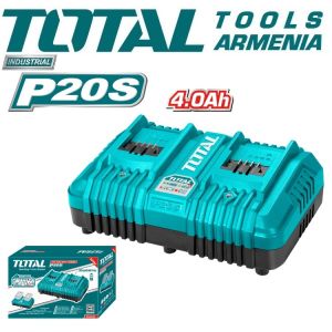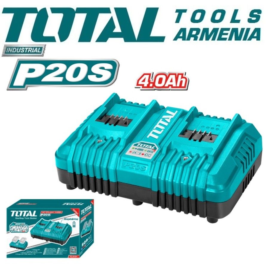 Двухпортовое быстрое интеллектуальное зарядное устройство 20 В TOTAL TCLI2024 Тип - быстрое интеллектуальное зарядное устройство. Тип аккумуляторных батарей - Li-ion(Литий-ионный). Напряжение - 20В. Ток заряда - 4Ач. Заряжает аккумулятор 20 В, 2,0 Ач - за 0,5 часа (30 минут). Заряжает аккумулятор 20 В, 4,0 Ач - за 1 час (60 мин). Упаковано в цветную коробку. Емкость аккумулятора - 4000 мАч. Быстрое интеллектуальное зарядное устройство TOTAL TCLI2024 подходит для зарядки аккумуляторов TOTAL с напряжением 20 В. Полная зарядка одного аккумулятора занимает примерно 1 час. Устройство оснащено светодиодным индикатором заряда.