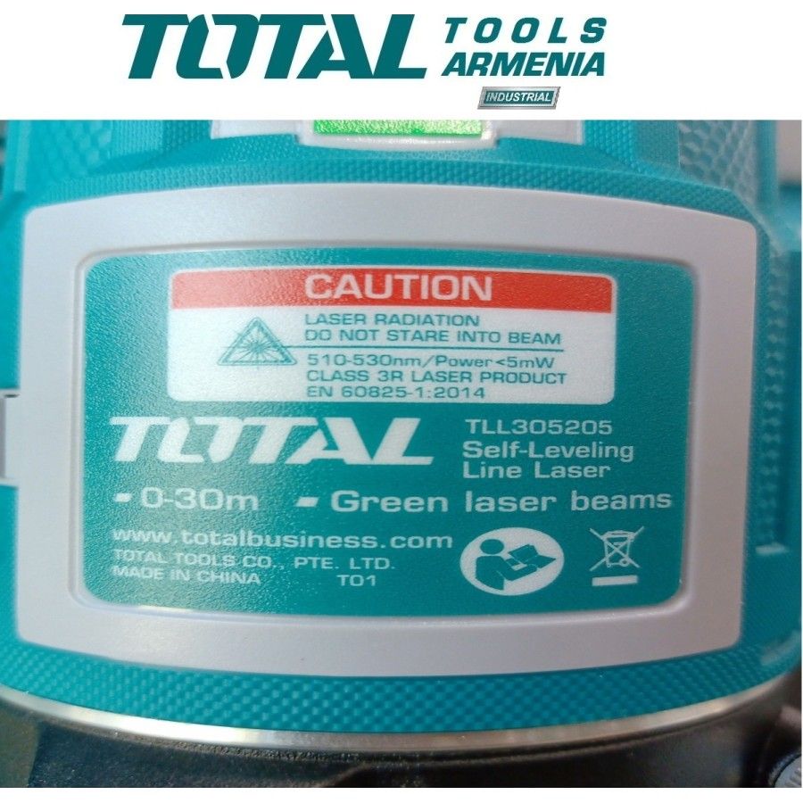 Самовыравнивающийся линейный лазер ( зеленый лазерные лучи) TOTAL TLL305205 Рабочий диапазон: 0 ~ 30 м 1 горизонтальная линия 4 вертикальные линии Точность нивелирования: ± 1,0 мм на 5 м Точность линии ± 1,5 мм на расстоянии 5 м Время выравнивания <3 с С функцией Cross Lock С функцией усиления лазера Рабочая температура 0 ~ + 40 ℃ Температура хранения -20 ~ + 70 ℃ Батарейки AA (1,5 В) * 4 Вес без батареек 980 г Диапазон самовыравнивания ≤3 ° Тип лазера:зеленыйКласс лазера 3R , <5 мВт Без штатива, подходит для штатива TLLT01152 Упаковано в пластиковую коробку В комплекте: защитные очки, крепежный ремень, кабель USB и 4 батареи. Этот лазерный инструмент автоматически определяет горизонтальные и вертикальные планы. -Лазер проецирует отдельно или одновременно 1 горизонталь и на потолок, а также одну точку отвеса. - Визуальное и звуковое предупреждение появляется, когда лазер находится за пределами диапазона самонивелирования. -Импульсный режим излучает импульсы, которые могут быть обнаружены детектором, увеличивая дальность действия продукта до 50 м / 60 м (165 ‘/ 200’). -Ручной режим позволяет угловую раскладку / маркировку. -Запорный механизм защищает маятник во время транспортировки или когда лазер не используется. -Прорезиненный противоударный корпус. -Регулируемые по высоте опорные ножки.