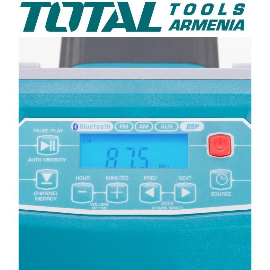 Литий-ионная рабочая радиостанция TOTAL TJRLI2001 Тип - рабочее радио. Напряжение - 20В. Частота АМ - 522-1620 кГц. Частота FM - 87,5-108 МГц. Вспомогательный разъем - 3,5 мм. Мощность динамика - 3Вт. Bluetooth - 4.0. Порт зарядки - USB. Аккумулятор и зарядное устройство - в комплект не входят. Вес - 1кг. Упаковано в картонную коробку. Радиоприемник отличается наличием интерфейса Bluetooth, что дает возможность слушать музыку со смартфона или планшета без использования проводов. Для удобства использования настройки каналов AM / FM сохранены. Длительный срок службы обеспечивается пыленепроницаемым, брызгозащищенным и ударопрочным корпусом.