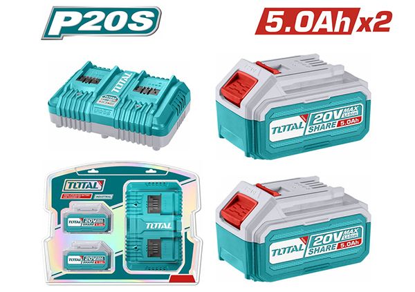 Литий-ионный аккумулятор и комплект зарядного устройства TOTAL TFBCPK2425 Напряжение аккумулятора: 20 В. С литий-ионным аккумулятором из 2шт ( TFBLI2053 ). С зарядным устройством 1 шт. ( TCLI2034E ). Литий-ионный аккумулятор емкостью 5,0 Ач. Индикатор заряда батареи. Одна батарея подходит для всех нескольких инструментов P20S. Входное напряжение: 220-240 В ~ 50/60 Гц. Выходное напряжение: 20В. Выходной ток: 4А. Вмещает до 2шт аккумуляторных батарей P20S. Два активных порта для одновременной зарядки аккумулятора. Упакован в двойной блистер.