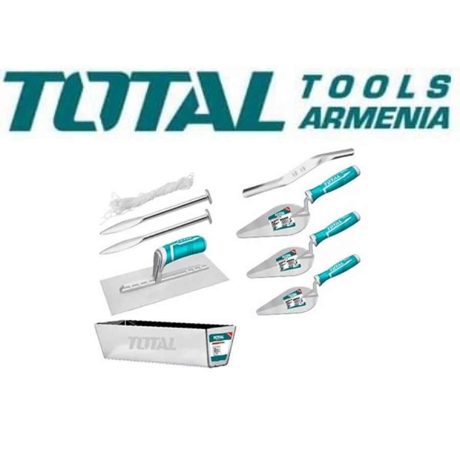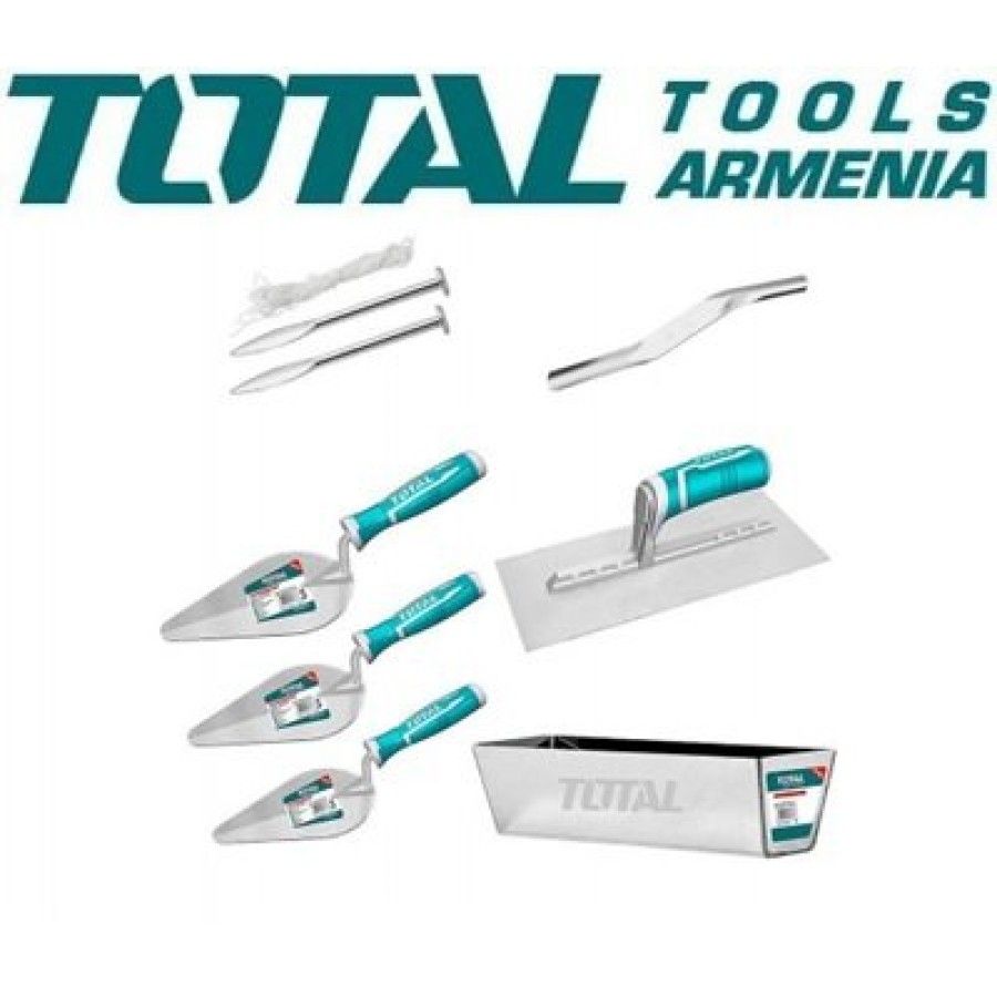 Набор инструментов для кладки и штукатурки 9 шт TOTAL THKBPS0906 В комплект входит: 1 шпатель для кладки кирпича диаметром 150 мм (6 дюймов) 1 шпатель для кладки кирпича диаметром 180 мм (7 дюймов) 1 шпатель для кладки кирпича диаметром 200 мм (8 дюймов) 1 шпатель 280х130мм 1 шпатель для штукатурки 315 мм (12 дюймов) Кирпичный разъем 1/2 x 5/8 дюйма 2 линейных инструмента