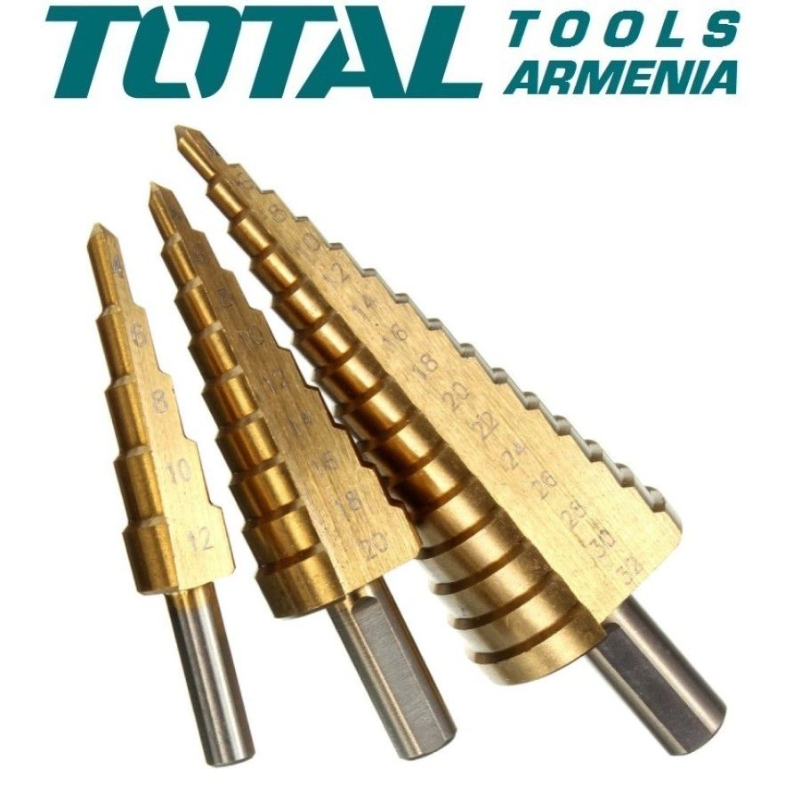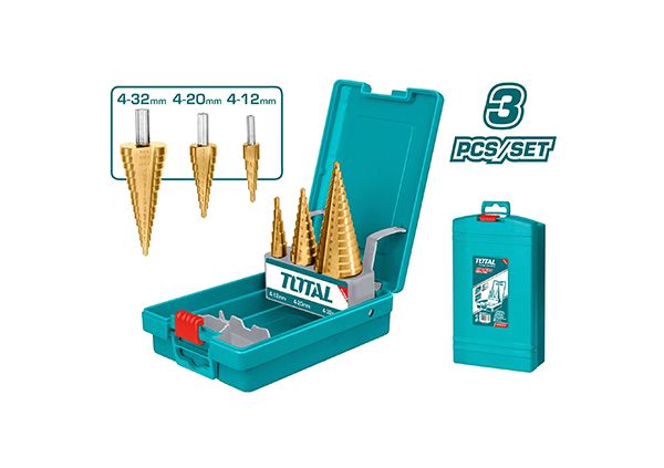 В комплектации:Набор ступенчатых сверл из 3 предметов 1шт 4-12мм, 1мм/шаг, диаметр соединения: 6мм 1шт 4-20мм, 2мм/шаг, диаметр соединения: 8мм 1шт 4-32мм, 2мм/шаг, диаметр соединения: 10мм