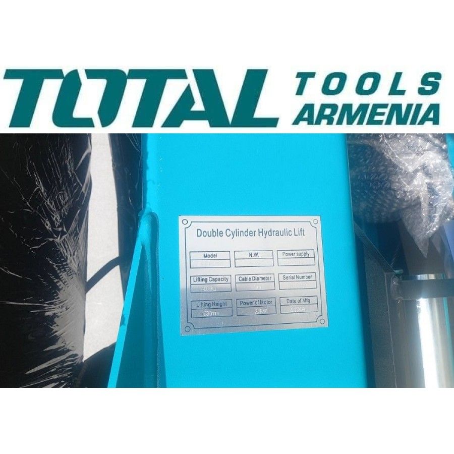 Подъемник для автотехобслуживания (домкрат) TOTAL THCLP22401 THCLP22401 подъемник (домкрат) используется при выполнении ремонтных и сервисных работ по автомобилям. Имеется стабильная фиксация на разных уровнях высоты, что исключает опрокидывание автомобиля. Максимальный вес: 4 тонн Мощность двигателя: 2,2 кВт Электрическая цепь: 380 В Время подъема: 50 сек. Вес нетто: 715 кг