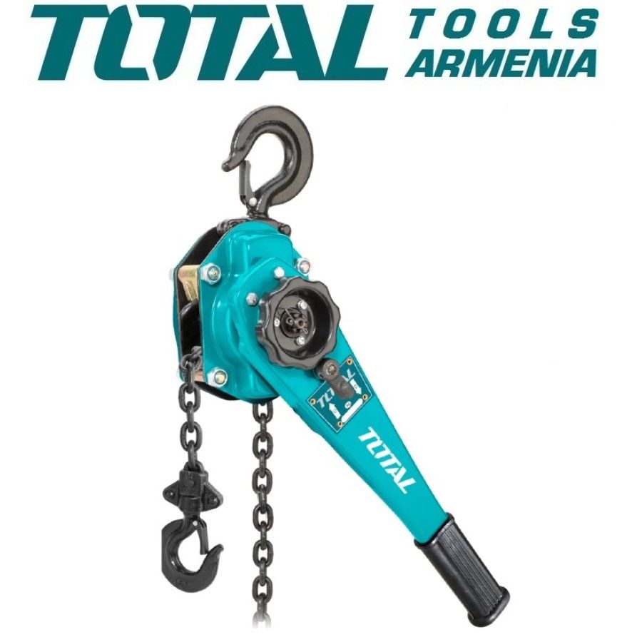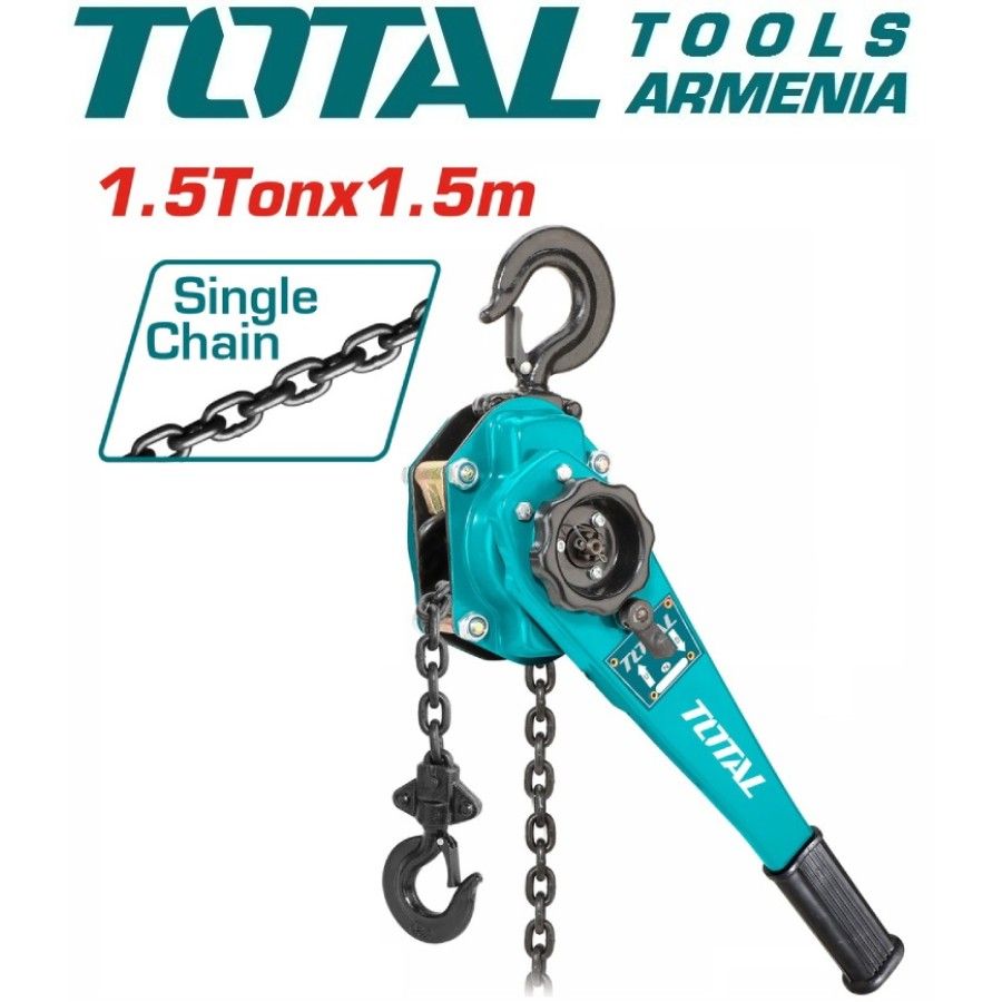 Рычажный блок 1,5 м 1,5 т TOTAL THSLB1501 Высота подъема - 1.5 м. Номинальная грузоподъемность подъемника - 1.5т. Пряди грузовой цепи: 1. Расстояние от крючка до крюка - 350 мм. Тяга Цепи Для Подъема Полной Нагрузки: 236 Н. Вес - 10.1 кг. Упакован в деревянный ящик. Рычажный блок предназначен для натяжения тросов и проводов при монтаже и ремонте контактной сети, а также при перемещении грузов и других работах.