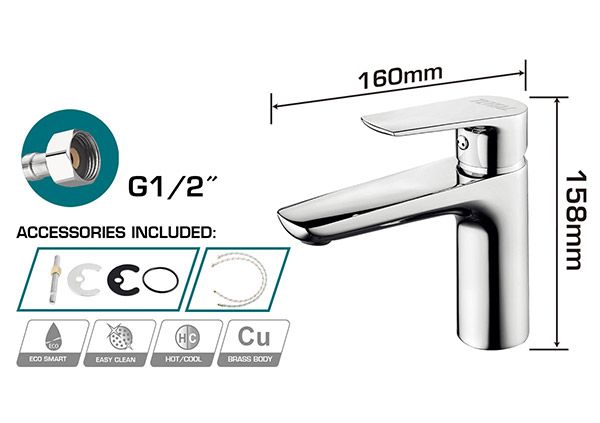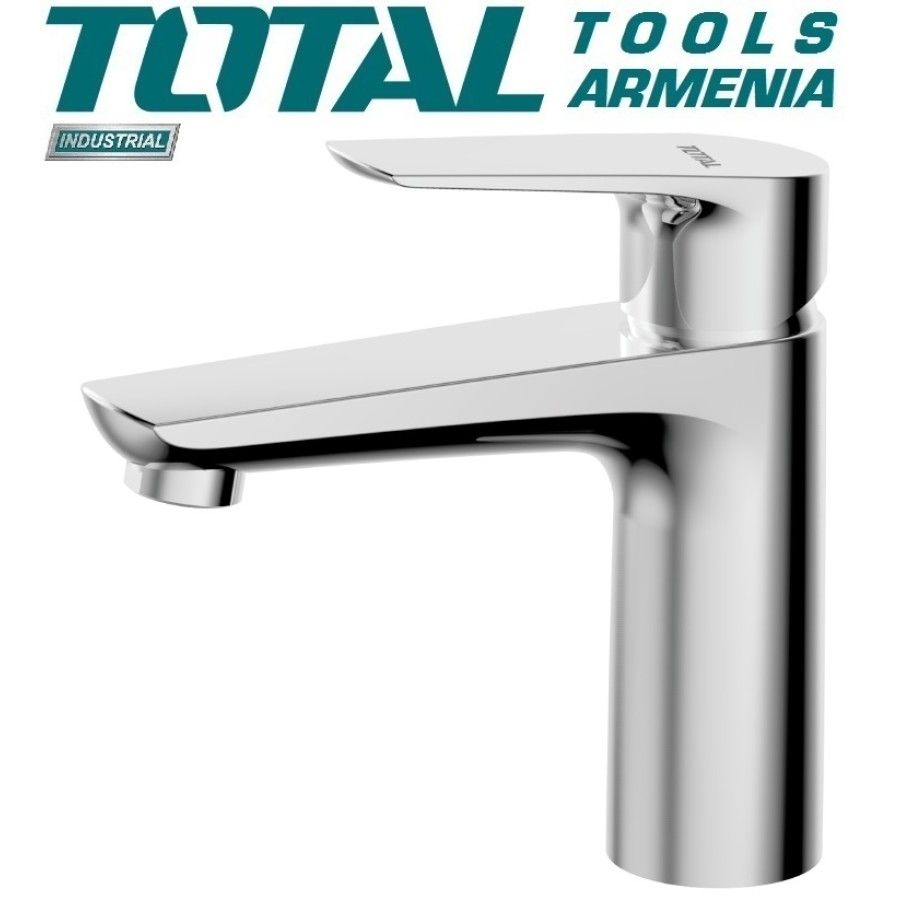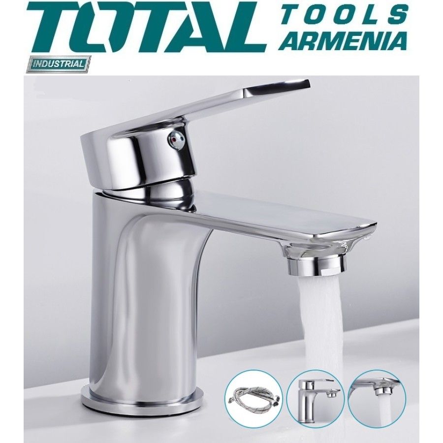 Смеситель для умывальника однорычажный TOTAL TSLBM11501 Высота 158 мм Внешний диаметр 45 мм Входной гибкий шланг 1/2 дюйма Надежная вставка регулятора расхода Качественный керамический картридж. Полированный и хромированный
