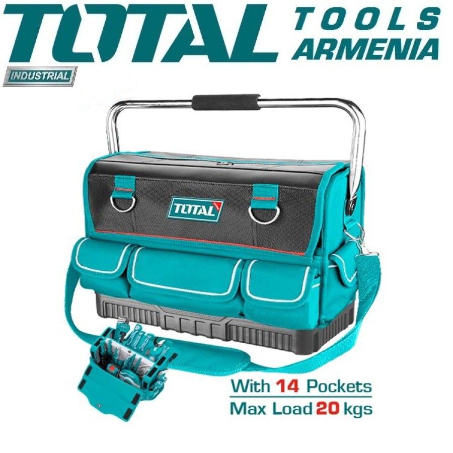 Сумка для инструментов 16" TOTAL THT66L01 Тип сумки Материал Полиэстер 600D Размер 16 " Цвет зеленый и черный Жесткая рама для легкого открывания и доступа Мягкая ручка из поролона для комфорта Прочная стальная ручка для удобной переноски Максимальная нагрузка 20 кг Количество секций 14шт Сумка TOTAL THT66L01 предназначена для хранения и транспортировки инструментов. Обеспечивает удобное использование всей необходимой насадки в нужное время. Незаменим, когда инструмент всегда должен быть под рукой.