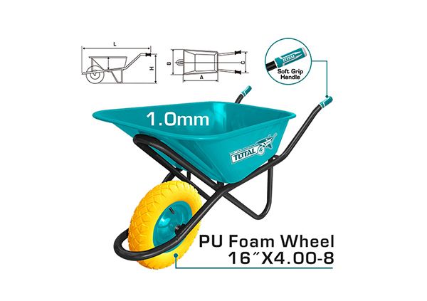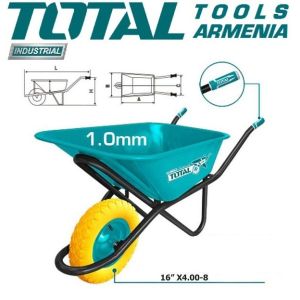 Тачка 150кг TOTAL THTWB64018GPU Тип - тачка. Максимальный объем - 90 л. Максимальный вес - 150 кг. Толщина стенки корпуса - 1 мм. Материал - сталь. Ручка - мягкая. Тип колеса - полиуретановый . Количество колес - одно. Вес - 15.8кг. Тачка TOTAL THTWB64018GPU имеет небольшую вместимость и габариты для использования в ограниченном пространстве. Наличие одного колеса значительно упрощает маневрирование.