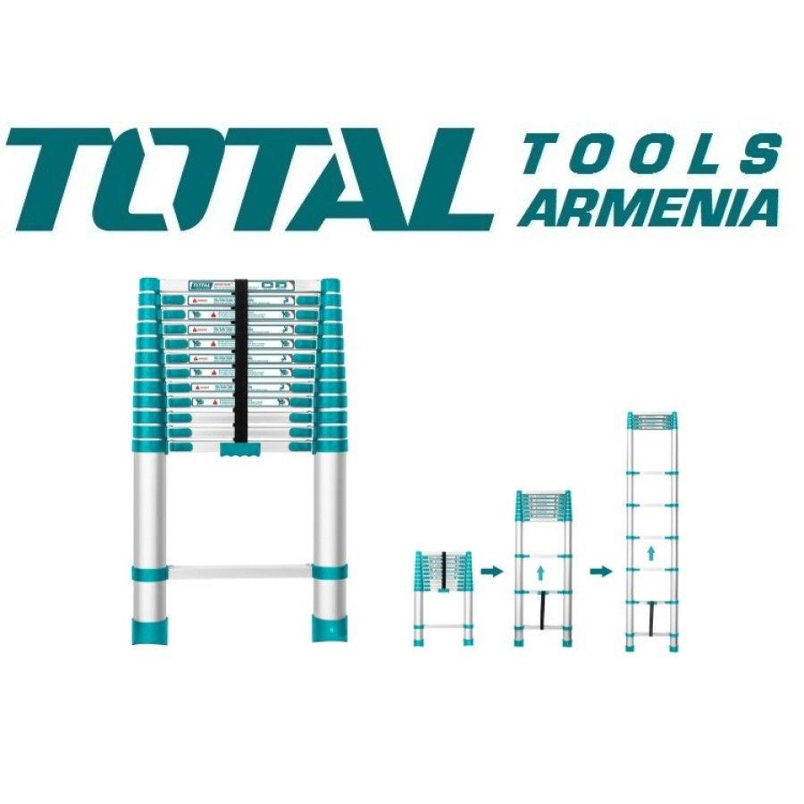 Телескопическая лестница 12 ступеней TOTAL THLAD08121 Количество шагов: 12 шагов Материал: алюминий Внешняя высота: 378 см Расстояние между ступенями: 30 см Высота в сложенном виде: 84,3 см. Ширина в сложенном виде: 49,4 см Максимальная нагрузка: 150 кг Легко носить THLAD08121 12-ступенчатая телескопическая лестница незаменима при выполнении различных работ на высоте. Выдерживает нагрузку до 150 кг благодаря прочной алюминиевой конструкции. Он компактен и удобен в хранении.