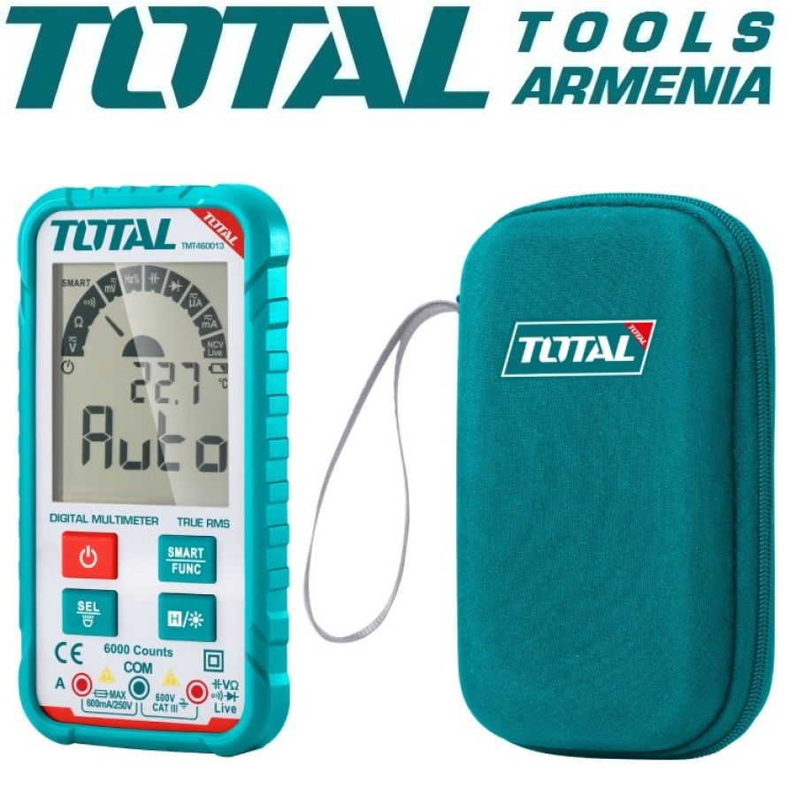 Цифровой мультиметр 3 TOTAL TMT460013 Цифровой мультиметр TOTAL TMT460013 предназначен для измерения напряжения, постоянного тока и сопротивления. Полученные результаты отображаются на ЖК-дисплее с крупными цифрами.Выбор предела измерения величин осуществляется вручную, достаточно установить нужное положение многопозиционного переключателя. Наличие подсветки облегчает работу в слабоосвещенных местах. Функции: Индикатор поэзии Освещение экрана Умение следовать инструкциям. Цифровой мультиметр RMS-дисплей на 6000 отсчетов Напряжение постоянного тока 60 мВ / 600 мВ / 6 В / 60 В / 600 В / 600 В Напряжение переменного тока 60 мВ / 600 мВ / 6 В / 60 В / 600 В / 600 В Постоянный ток 6000 мкА / 60 мА / 600 мА Переменный ток 6000μA / 60mA / 600mA Сопротивление 600 Ом / 6 кОм / 60 кОм / 600 кОм / 6 МОм / 60 МОм Емкость 6 нФ / 60 нФ / 600 нФ / 6 мкФ / 60 мкФ / 600 мкФ / 6 мФ / 60 мФ Бесконтактное обнаружение напряжения С функцией индикации низкого заряда батареи Авто-выключение Упаковано цветной коробкой