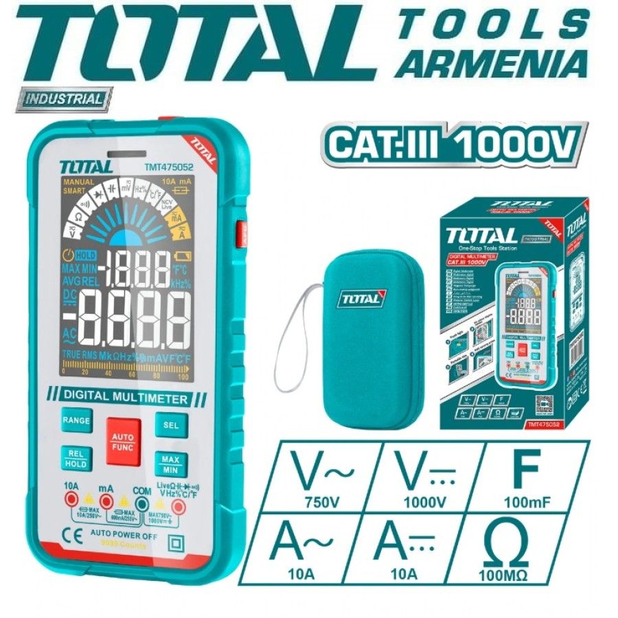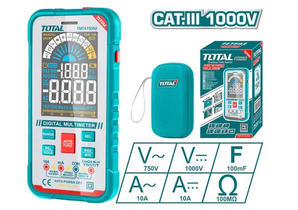 Цифровой мультиметр 4 TOTALTMT475052 Цифровой мультиметр TOTAL TMT475052 предназначен для измерения напряжения, постоянного тока и сопротивления. Полученные результаты отображаются на ЖК-дисплее с крупными цифрами.Выбор предела измерения величин осуществляется вручную, достаточно установить нужное положение многопозиционного переключателя. Наличие подсветки облегчает работу в слабоосвещенных местах. Функции: Индикатор поэзии Освещение экрана Умение следовать инструкциям. Цифровой мультиметр RMS-дисплей на 10000 отсчетов Напряжение постоянного тока: 99,99 мВ/999,9 мВ; 9,999 В/99,9 В/ 1000 В Напряжение переменного тока: 99,99 мВ/999,9 мВ; 9,999 В / 99,9 В / 750 В Постоянный ток: 9,999 мА99,99 мА/600,0 мА; 9999А Переменный ток: 9,999 мА99,99 мА/600,0 мА; 9999А Сопротивление: 99,99 Ом / 999,9 Ом / 9,999 кОм / 99,99 кОм / 999,9 кОм / 9,999 МОм; 99,99 МОм Бесконтактное обнаружение напряжения С функцией индикации низкого заряда батареи Авто-выключение Упаковано цветной коробкой