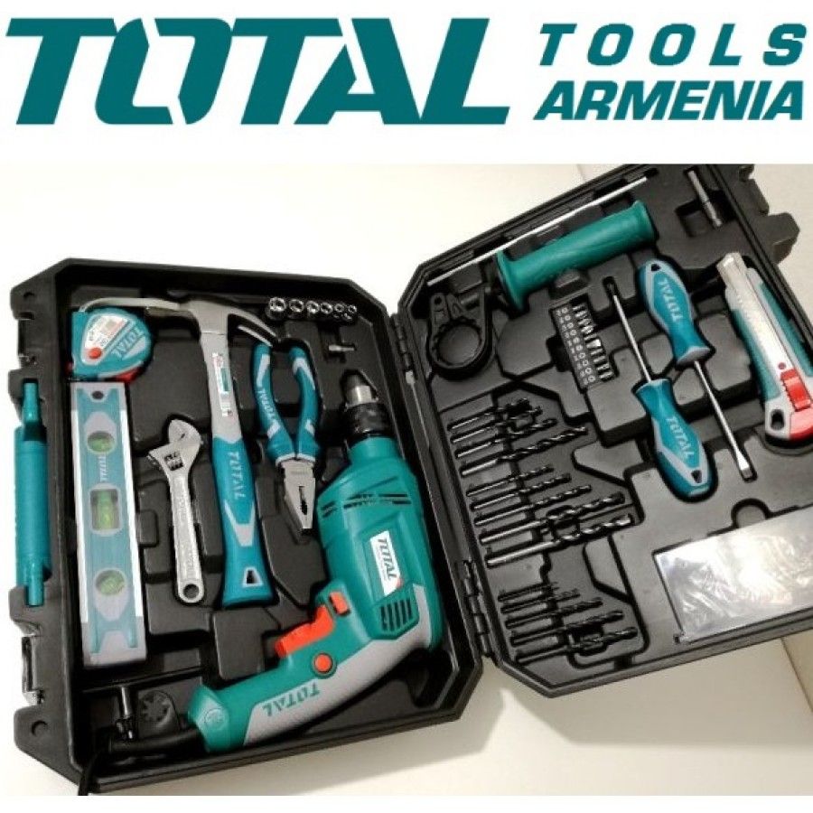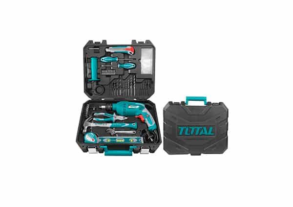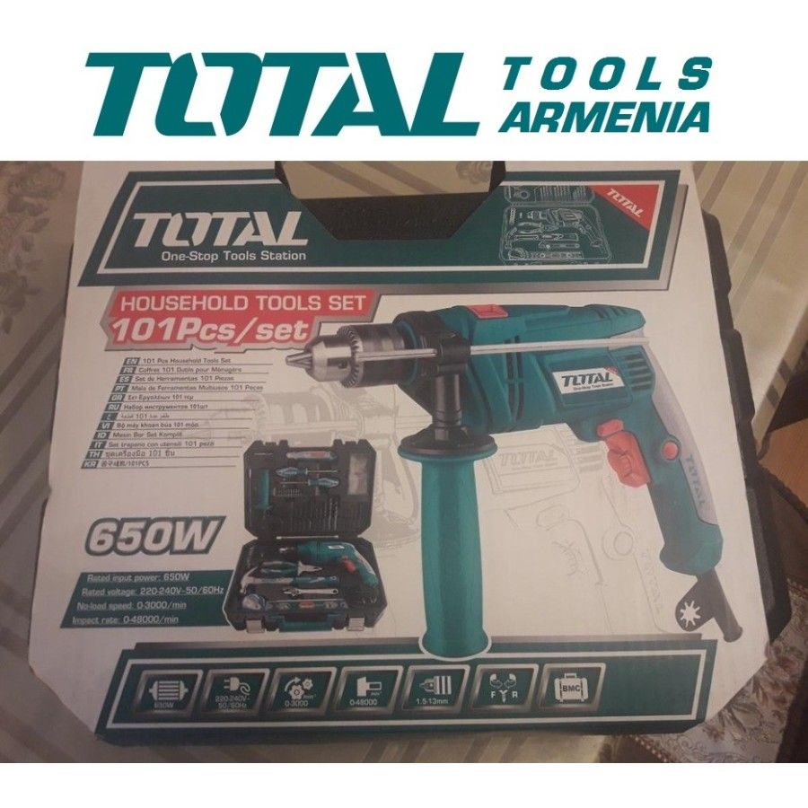 TotalTHKTHP1012 Набор инструментов 101 шт. Комплектация Дрель ударная 650 Вт; Молоток 220 гр.; Отвертка SL5.5 * 100; Отвертка PH1 * 100; Комбинированные плоскогубцы 160 мм; Ключ разводной 150 мм; Уровень строительный; Рулетка измерительная 3 м.; Нож с отламывающимся лезвием; Сверла по металлу 2,3,4,5,6 мм - 5 шт.; Сверла по бетону 4,5,6,8,10 мм - 5 шт.; Сверла по дереву 4,5,6,8 мм - 4 шт.; Торцевые головки 1/4 ", 5 мм 6 мм 8 мм 9 мм 10 мм 11 мм - 6 шт.; Адаптер для торцевых головок 4-6 мм (25 мм) - 1 шт.; Отверточный биты PH1, PH2, PZ1, PZ2, SL4, SL6, HEX4, HEX5, T20, T25 - 10 шт.; Держатель бит; Саморезы (10 шт. * ST3.5,10 шт. * ST4,10шт * ST5) - 30 шт.; Дюбель пластиковый (10шт * 5мм, 10шт * 6мм, 10шт * 8мм) - 30 шт; Пластиковый кейс. Преимущества Воздушное охлаждение для надежности; Дополнительная рукоятка для удобства работы; Ключевой патрон для надежной фиксации оснастки; Регулировка оборотов для универсального применения; Пластиковый кейс для удобства хранения и транспортировки TOTAL THKTHP1012. Данная информация скопирована со страницы: https://www.vseinstrumenti.ru/instrument/dreli/udarnye/total/s-naborom-aksessuarov-101-sht-thkthp1012/?utm_source=ca&utm_medium=cpa&utm_campaign=5c61&click_id=4yBZ1RJhjRZezA3&cc=31g34UNzAXjsXSFaM_pGTQ