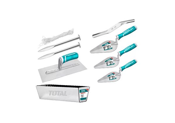 Набор инструментов для кладки и штукатурки 9 шт TOTAL THKBPS0906 В комплект входит: 1 шпатель для кладки кирпича диаметром 150 мм (6 дюймов) 1 шпатель для кладки кирпича диаметром 180 мм (7 дюймов) 1 шпатель для кладки кирпича диаметром 200 мм (8 дюймов) 1 шпатель 280х130мм 1 шпатель для штукатурки 315 мм (12 дюймов) Кирпичный разъем 1/2 x 5/8 дюйма 2 линейных инструмента