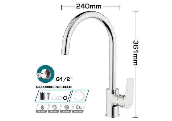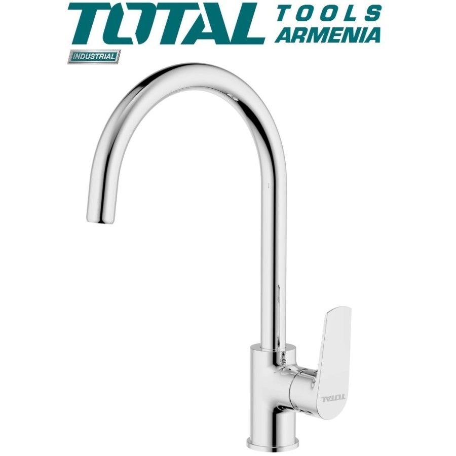 Однорычажный смеситель для мойки TOTAL TSLBM23401 Высота 361 мм Внешний диаметр 50 мм Входной гибкий шланг 1/2 дюйма Надежная вставка регулятора расхода Качественный керамический картридж. Полированный и хромированный