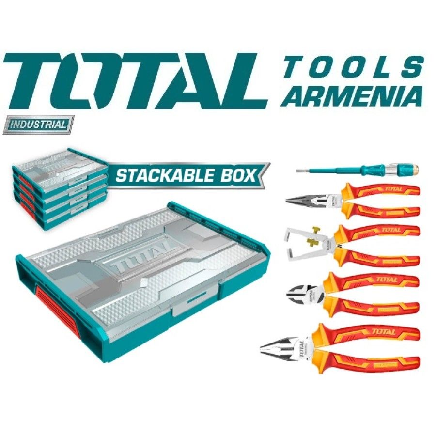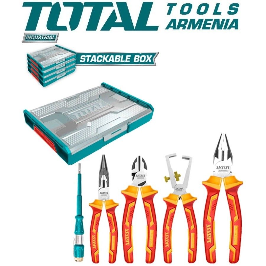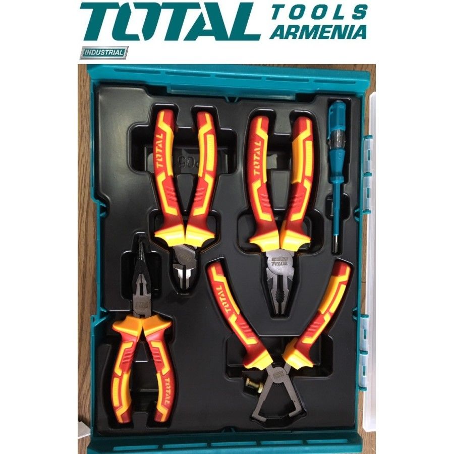 Набор диэлектрических инструментов до 1000В 5шт TOTAL THKTV02P051 1шт - изолированные длинногубцы 160мм (6 дюймов) 1шт - изолированные диагональные кусачки 160 (6 дюймов) 1шт - изолированные плоскогубцы 180мм (7дюймов) 1шт - Диэлектрические Клещи Для Снятия Изоляции 160 мм (6 дюймов ) 1шт - тестовый карандаш 140мм Упаковано в пластиковую коробку