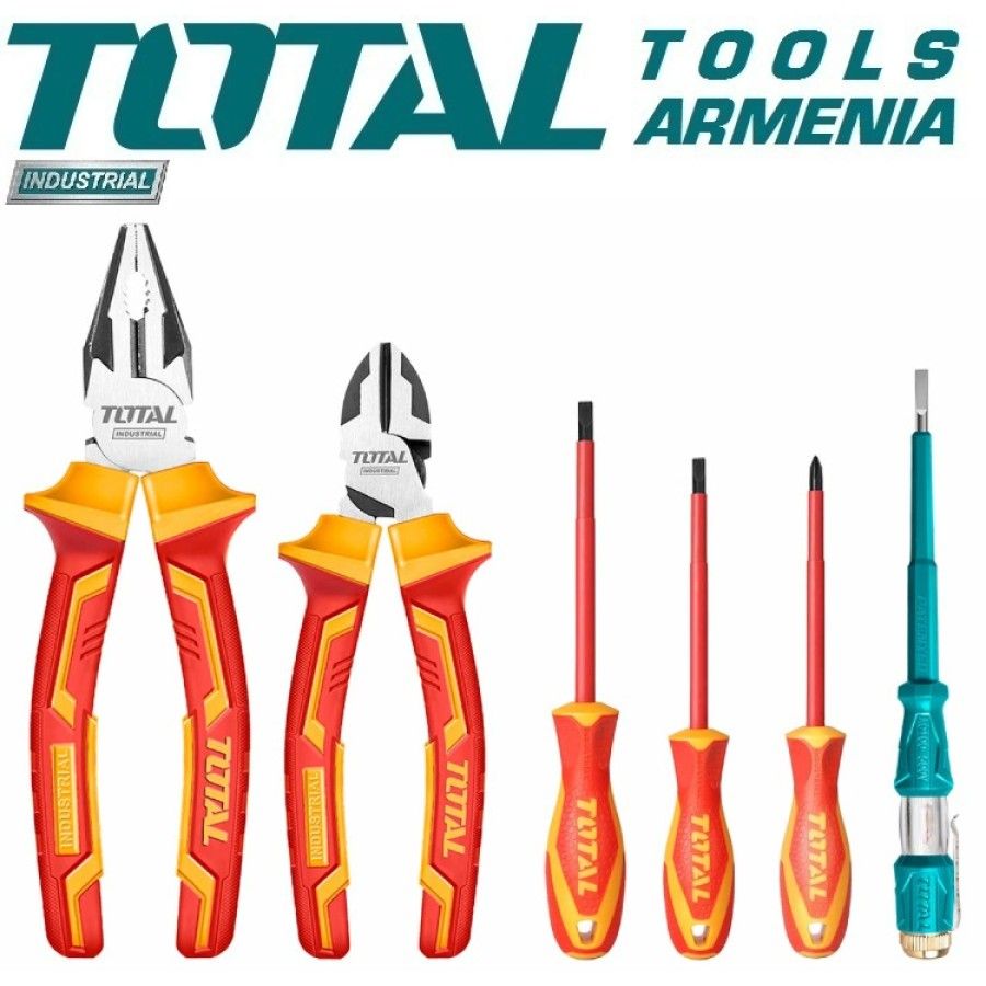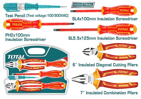 Набор диэлектрических инструментов до 1000В 6шт TOTAL THKIST3062 1шт - изолированные диагональные кусачки 160 (6 дюймов) 1шт - изолированные плоскогубцы 200мм (8дюймов) 1шт - отвертка Phillips изолированная PH2x100мм 2шт - отвертка шлицевая изолированная SL5.5x125мм, SL4x100мм 1шт - тестовый карандаш 140мм Упаковано в блистер