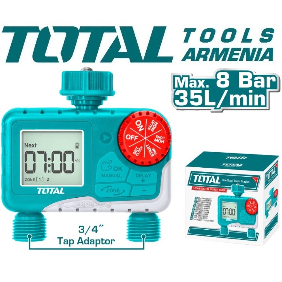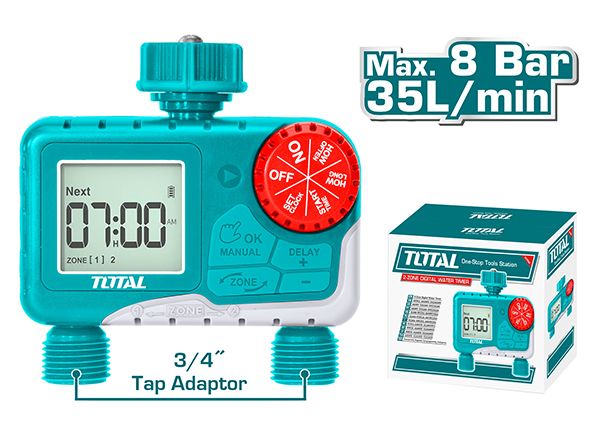 2-зонный цифровой таймер подачи воды TOTAL THHCQ9206 Адаптеры 2 шт. 3/4 дюйма Максимальный поток 35 л/мин Максимальное давление воды 8 бар / 116 фунтов на квадратный дюйм Питание от 2 батареек типа АА (не входят в комплект) 12 / 24 часовой вариант IPX 4 Индивидуальная система настройки Функция задержки дождя на 24 часа Предупреждение о низком энергопотреблении Упаковано в цветную коробку