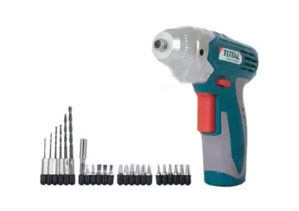 Миниатюрный Аккумуляторная отвертка (шуруповерт) TOTAL TD4486 4,8В, 3,7Нм + биты Миниатюрный аккумуляторный шуруповерт TOTAL TD4486 питается от никель-кадмиевого аккумулятора ёмкостью 800мА, обеспечивая тем самым максимальную автономность при использовании вдалеке от электросетей. Мощность данной модели составляет 5 Вт при скорости без нагрузки от 0 до 180 оборотов в минуту, при этом максимальный крутящий момент составляет 3.7Нм. Быстрозажимной патрон позволяет оперативно и надёжно закреплять биты и сверла диаметром от 0,8 до 10мм. Светодиодная подсветка и индикатор состоянии заряда облегчают работу с данным шуруповертом. Комплектация включает шуруповерт, зарядное устройство, держатель для бит, 17 бит, 6 сверел с шестигранным хвостовиком, инструкцию и гарантийный талон, а также блистерную упаковку. Машина оснащена светодиодной подсветкой для освещения рабочей зоны. Устройство имеет функцию преобразования с переменной скоростью. На машине только отображается заряд батареи. Машина может способствовать и обратного вращения. Запасные части: Мотор TD4486-SP-17 Переключатель TD4486-SP-25