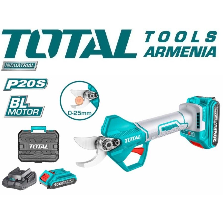 Аккумуляторный электрический секатор TOTAL TSSLI202581 Модель №. TSSLI202581 Напряжение 20В Диаметр резки 25 мм Автономность с батареей 2 Ач - 3000 сокращений с батареей 4 Ач - 5000 сокращений Время зарядки 2Ач - 1 час Время зарядки 4Ач - 2 часа Батарея в комплект входит. Совместима с батареями 2,0 Ач и 4,0 Ач Зарядное устройство в комплект входит Аккумуляторные секаторы используются для ухода за садовыми деревьями и кустарниками. Способен обрезать ветки до 2.5-х сантиметров в диаметре. Инструмент питается от аккумулятора на 20 В, что позволяет выполнять плавный рез без особых усилий. Секатор оснащен высокопрочными лезвиями, они имеют антикоррозионную обработку, что обеспечивает длительный срок службы.