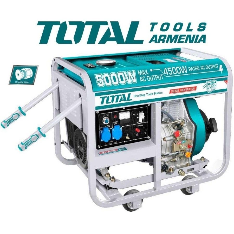 Дизель-генератор (стартер) Total TP450001 5000 Вт Генераторы дизельные TP450001,конструкция устройства элегантность, простота в эксплуатации и высокая долговечность при весе102 кг,включая колеса и ручное тяговое усилие, помогают легко перемещаться и удобно использовать в семье, на заводе. Удобная для пользователя полная панель управления. Автоматический выключатель переменного тока. Система AVR обеспечивает точный контроль напряжения. Не требующий обслуживания аккумулятор. Машина имеет компактную конструкцию, проста, удобна в перемещении и использовании. В случае сбоев энергоснабжения позволяет обеспечить освещениемдом, а также работу основных бытовых устройств (электрический чайник, холодильник, обогреватель и пр.). Машина работает плавно, малошумно. Двигатель легко заводится, чувствителен и экономичен. Максимальная мощность : 5000 Вт. Постоянная мощность: 4500 Вт. Регулятор напряжения: AVR. Переменный ток 2 x 220/240 В ~ 50 Гц / 20 А .Оборудован аналоговым вольтметром. Постоянный ток 1 х 12 вольт (8,3 а). Н оминальная скорость : 3000об / мин․ Д вигатель : 4-Т актный Дизель. Рабочий объем цилиндра: 418 мл.Диаметр поршня X: 86 x 72 мм. Мощность двигателя: 9 л.с.Время непрерывной работы: 9 часов.Система охлаждения: вентилятором. Система запуска: Автоматическая блокировка. Система запуска: механическая + электрическая. Система зажигания: TCI. Емкость топливного бака: 15 Л.Большой металлический топливный бак с сетчатым фильтром. Расход топлива: ≤ 280 г / кВт · ч.Емкость масла: 1,65 л.Индикатор уровня масла. Масло: SAE 15W30, 15W40. Уровень шума: 95 дБ.Оборудован колесами и ручками, обеспечивающими легкое перемещение генератора. Вес: 102 кг. Гарантия։ 1 год. - Дизель-генераторы более экономичны, чем бензиновые. - Дизельный двигатель сильнее и мощнее, работает быстрее, что позволяет экономить топливо, а расходы на топливо дешевы - Электроэнергия, вырабатываемаядизельными генераторами, на 11% выше, чем бензиновые генераторы. -Дизельныйгенераторы не вызывают антисанитарии и не выделяют много дыма, который загрязняет окружающую среду.