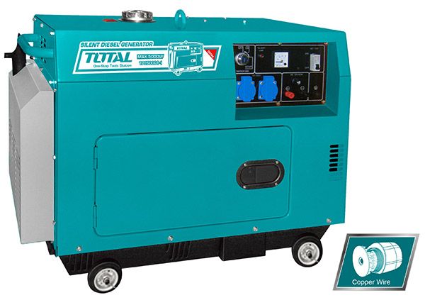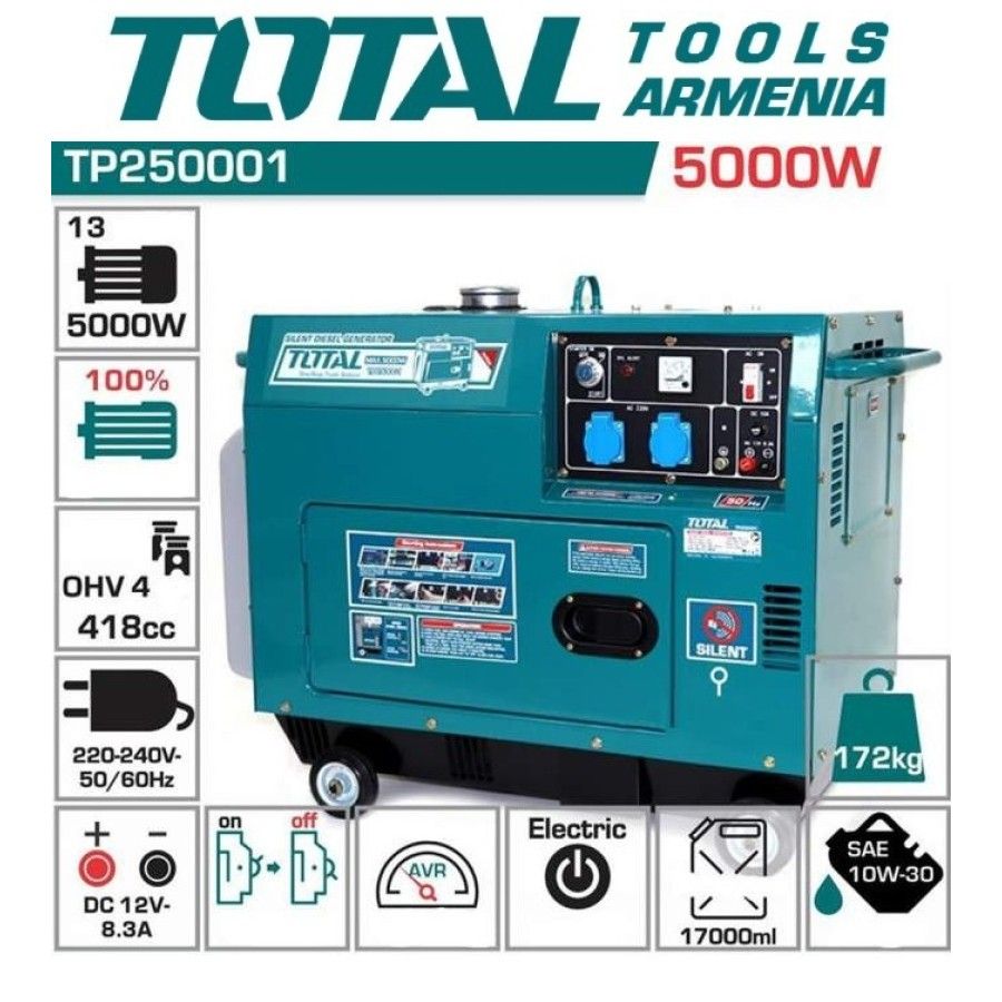 Дизель-генератор (стартер) Бесшумный Total TP250001 5000 Вт Генераторы дизельные TP250001,конструкция устройства элегантность, простота в эксплуатации и высокая долговечность при весе172 кг,включая колеса и ручное тяговое усилие, помогают легко перемещаться и удобно использовать в семье, на заводе. Удобная для пользователя полная панель управления. Автоматический выключатель переменного тока. Система AVR обеспечивает точный контроль напряжения. Не требующий обслуживания аккумулятор. Машина имеет компактную конструкцию, проста, удобна в перемещении и использовании. В случае сбоев энергоснабжения позволяет обеспечить освещениемдом, а также работу основных бытовых устройств (электрический чайник, холодильник, обогреватель и пр.). Машина работает плавно, малошумно. Двигатель легко заводится, чувствителен и экономичен. Максимальная мощность : 5000 Вт. Постоянная мощность: 4500 Вт. Регулятор напряжения: AVR. Переменный ток 2 x 220/240 В ~ 50 Гц / 20 А .Оборудован аналоговым вольтметром. Постоянный ток 1 х 12 вольт (8,3 а). Н оминальная скорость : 3000об / мин․ Д вигатель : 4-Т актный Дизель. Рабочий объем цилиндра: 418 мл.Диаметр поршня X: 86 x 72 мм. Мощность двигателя: 9 л.с.Время непрерывной работы: 9 часов.Система охлаждения: вентилятором. Система запуска: Автоматическая блокировка. Система запуска: механическая + электрическая. Система зажигания: TCI. Емкость топливного бака: 17 Л.Большой металлический топливный бак с сетчатым фильтром. Расход топлива: ≤ 310 г / кВт · ч.Емкость масла: 1,65 л.Индикатор уровня масла. Масло: SAE 15W30, 15W40. Уровень шума: 75 дБ.Оборудован колесами и ручками, обеспечивающими легкое перемещение генератора. Вес: 172 кг. Гарантия։ 1 год. - Дизель-генераторы более экономичны, чем бензиновые. - Дизельный двигатель сильнее и мощнее, работает быстрее, что позволяет экономить топливо, а расходы на топливо дешевы - Электроэнергия, вырабатываемаядизельными генераторами, на 11% выше, чем бензиновые генераторы. -Дизельныйгенераторы не вызывают антисанитарии и не выделяют много дыма, который загрязняет окружающую среду.