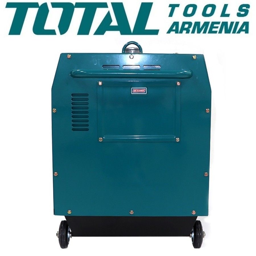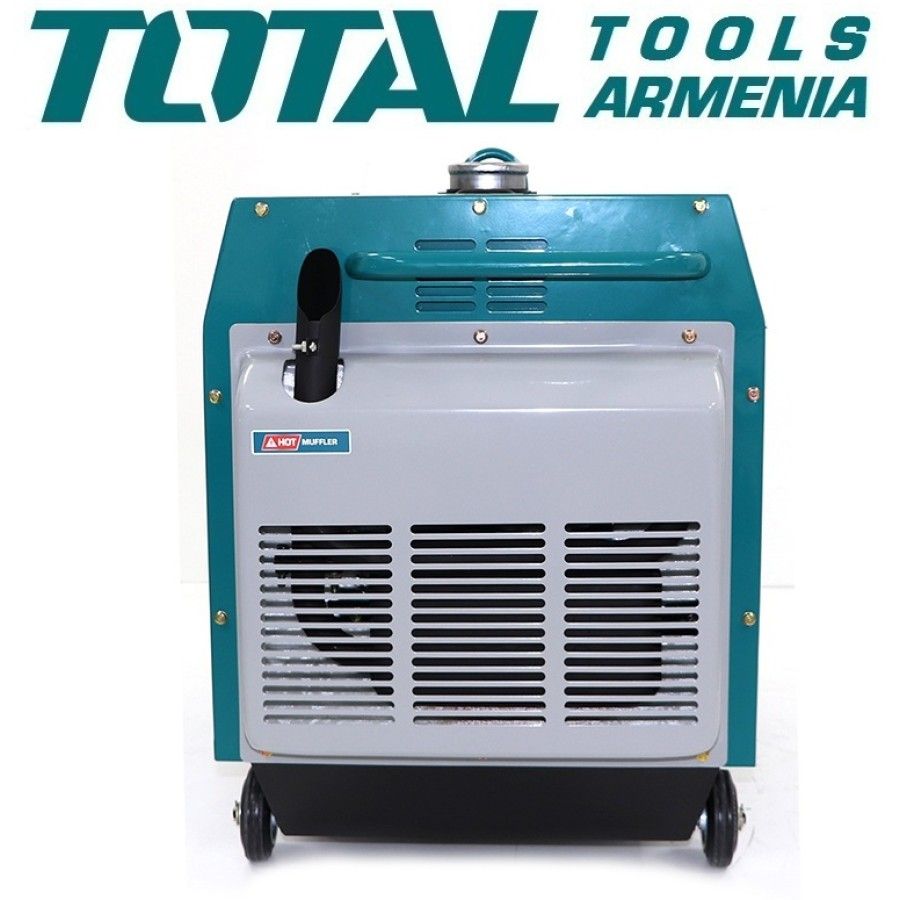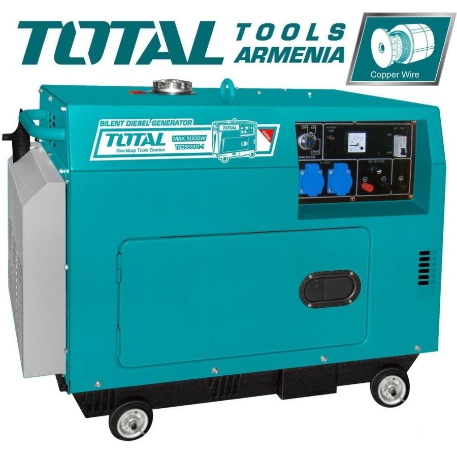 Дизель-генератор (стартер) Бесшумный Total TP250001-1 5000 Вт Генераторы дизельные TP250001-1,конструкция устройства элегантность, простота в эксплуатации и высокая долговечность при весе172 кг,включая колеса и ручное тяговое усилие, помогают легко перемещаться и удобно использовать в семье, на заводе. Удобная для пользователя полная панель управления. Автоматический выключатель переменного тока. Система ATS обеспечивает точный контроль напряжения. Не требующий обслуживания аккумулятор. Машина имеет компактную конструкцию, проста, удобна в перемещении и использовании. В случае сбоев энергоснабжения позволяет обеспечить освещениемдом, а также работу основных бытовых устройств (электрический чайник, холодильник, обогреватель и пр.). Машина работает плавно, малошумно. Двигатель легко заводится, чувствителен и экономичен. Максимальная мощность : 5000 Вт. Постоянная мощность: 4500 Вт. Регулятор напряжения: ATS. Переменный ток 2 x 220/240 В ~ 50 Гц / 20 А .Оборудован аналоговым вольтметром. Постоянный ток 1 х 12 вольт (8,3 а). Н оминальная скорость : 3000об / мин․ Д вигатель : 4-Т актный Дизель. Рабочий объем цилиндра: 418 мл.Диаметр поршня X: 86 x 72 мм. Мощность двигателя: 9 л.с.Время непрерывной работы: 9 часов.Система охлаждения: вентилятором. Система запуска: Автоматическая блокировка. Система запуска: электрическая. Система зажигания: TCI. Емкость топливного бака: 17 Л.Большой металлический топливный бак с сетчатым фильтром. Расход топлива: ≤ 310 г / кВт · ч.Емкость масла: 1,65 л.Индикатор уровня масла. Масло: SAE 15W30, 15W40. Уровень шума: 75 дБ.Оборудован колесами и ручками, обеспечивающими легкое перемещение генератора. Вес: 172 кг. Гарантия։ 1 год. - Дизель-генераторы более экономичны, чем бензиновые. - Дизельный двигатель сильнее и мощнее, работает быстрее, что позволяет экономить топливо, а расходы на топливо дешевы - Электроэнергия, вырабатываемаядизельными генераторами, на 11% выше, чем бензиновые генераторы. -Дизельныйгенераторы не вызывают антисанитарии и не выделяют много дыма, который загрязняет окружающую среду.