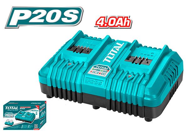 Двухпортовое быстрое интеллектуальное зарядное устройство 20 В TOTAL TCLI2024 Тип - быстрое интеллектуальное зарядное устройство. Тип аккумуляторных батарей - Li-ion(Литий-ионный). Напряжение - 20В. Ток заряда - 4Ач. Заряжает аккумулятор 20 В, 2,0 Ач - за 0,5 часа (30 минут). Заряжает аккумулятор 20 В, 4,0 Ач - за 1 час (60 мин). Упаковано в цветную коробку. Емкость аккумулятора - 4000 мАч. Быстрое интеллектуальное зарядное устройство TOTAL TCLI2024 подходит для зарядки аккумуляторов TOTAL с напряжением 20 В. Полная зарядка одного аккумулятора занимает примерно 1 час. Устройство оснащено светодиодным индикатором заряда.