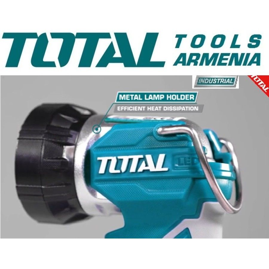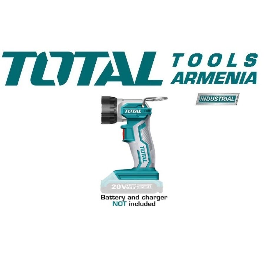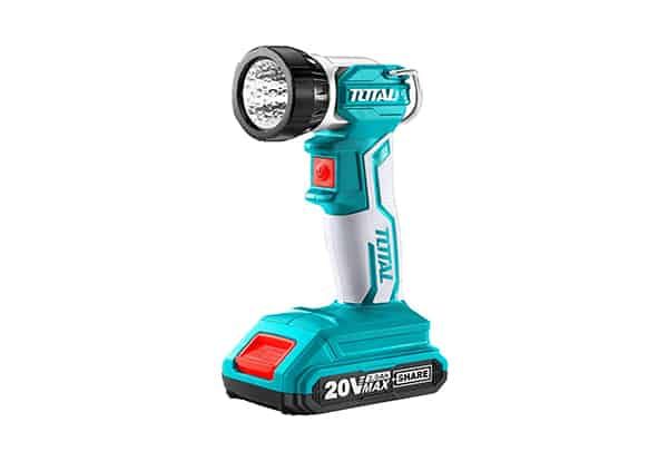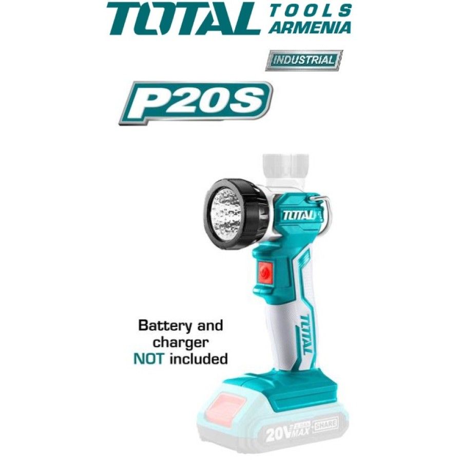 Фонарь с батареей TOTAL TWLI2001 В комплект не входят: Зарядное устройство Аккумулятор: Напряжение аккумулятора: 20 В /2A -4A Производительность в люменах: 225 Рассеиваемая мощность светодиода: 3,2 Вт Время зарядки. 1 час