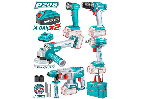 Комбинированный литий-ионный промышленный комплект из 5 шт. TOTAL TCKLI2019 Комбинированный литий-ионный промышленный комплект из 5 шт 20В. 1штл итий-ионный гайковерт ( TIWLI2038 ). 1штл итий-ионный ударная отвертка ( TDLI200528 ). 1штл итий-ионный п ерфоратор 2 дж /бесщеточный двигатель ( TRHLI20228 ). 1штл итий-ионный угловая шлифовальная машина( TAGLI201158 ). 1штл итий-ионный рабочей фонарь ( TWLI2023 ). Литий-ионныйгайковерт ( TIWLI2038 ): Бесщеточный двигатель. Квадратный привод: 1/2"". Скорость холостого хода: 0-1300/0-2100 об/мин. Скорость удара: 0-2000/0-3300 об/мин. Максимальный крутящий момент: 300 Нм. С 2шт гнездами (19 21 мм). Литий-ионнаяударная отвертка ( TDLI200528 ): Скорость холостого хода: 0-400/0-1500 об/мин. Максимальный крутящий момент: 45 Нм. Пластиковый патрон. Емкость патрона: 0,8-10 мм. Настройки крутящего момента: 15+1. Механическая 2-ступенчатая передача. Литий-ионный Перфоратор 2 Дж /Бесщеточный Двигатель( TRHLI20228 ): Бесщеточный двигатель. Напряжение: 20В. Скорость холостого хода: 0-1100 об/мин. Скорость удара: 0-5000 ударов в минуту. Энергия удара: 2,0 Дж. Максимальная мощность сверления: диаметр 26 мм в бетоне. Встроенный рабочий светильник. Патронная система SDS plus. С 3-мя сверлами и 1-мя долотами. Литий-ионная угловая шлифовальная машина ( TAGLI201158 ): Бесщеточный двигатель. Напряжение: 20В. Скорость холостого хода: 3000/8500 об/мин. Диаметр диска: 115 мм. Резьба шпинделя: M14. Рабочая лампа( TWLI2023 ): Напряжение: 20В. Рассеиваемая мощность светодиода: 1,5 Вт. Люмен: 150±10%. Напряжение зарядки: 220-240 В ~ 50/60 Гц. С 2-мя батарейными блоками емкостью 4,0 Ач ( TFBLI2002 ). С зарядным устройством 1 шт. ( TFCLI2001 ). Упакован в холщовый мешок.