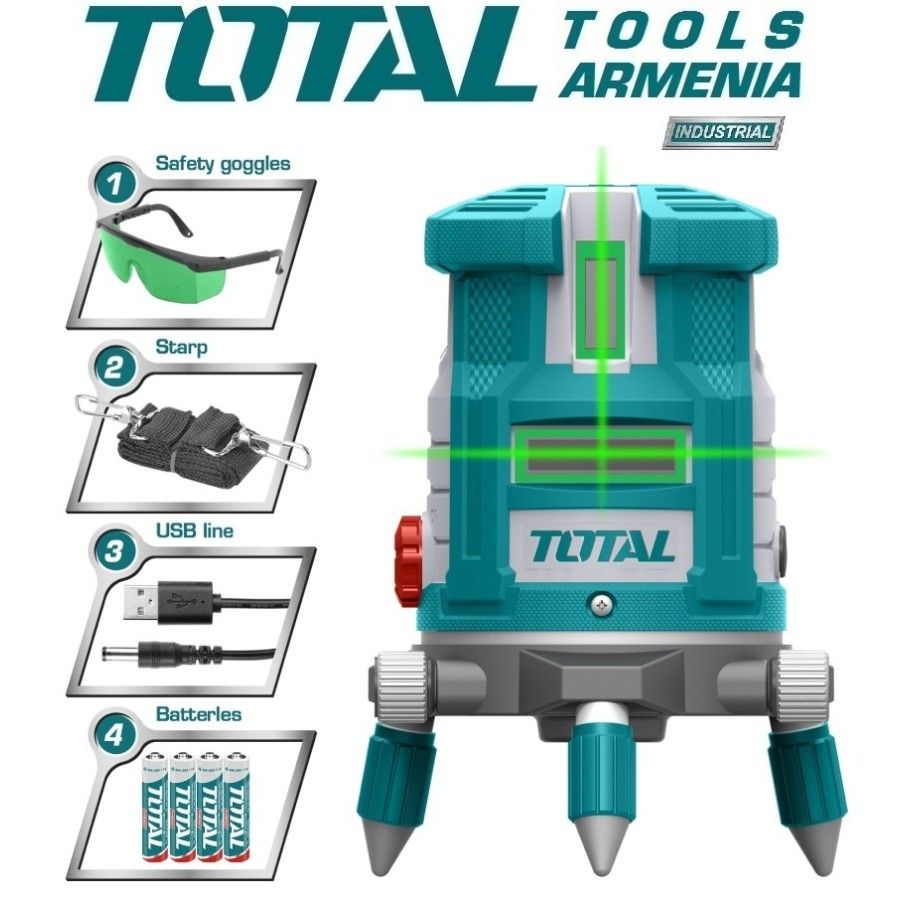 Самовыравнивающийся линейный лазер ( зеленый лазерные лучи) TOTAL TLL305205 Рабочий диапазон: 0 ~ 30 м 1 горизонтальная линия 4 вертикальные линии Точность нивелирования: ± 1,0 мм на 5 м Точность линии ± 1,5 мм на расстоянии 5 м Время выравнивания <3 с С функцией Cross Lock С функцией усиления лазера Рабочая температура 0 ~ + 40 ℃ Температура хранения -20 ~ + 70 ℃ Батарейки AA (1,5 В) * 4 Вес без батареек 980 г Диапазон самовыравнивания ≤3 ° Тип лазера:зеленыйКласс лазера 3R , <5 мВт Без штатива, подходит для штатива TLLT01152 Упаковано в пластиковую коробку В комплекте: защитные очки, крепежный ремень, кабель USB и 4 батареи. Этот лазерный инструмент автоматически определяет горизонтальные и вертикальные планы. -Лазер проецирует отдельно или одновременно 1 горизонталь и на потолок, а также одну точку отвеса. - Визуальное и звуковое предупреждение появляется, когда лазер находится за пределами диапазона самонивелирования. -Импульсный режим излучает импульсы, которые могут быть обнаружены детектором, увеличивая дальность действия продукта до 50 м / 60 м (165 ‘/ 200’). -Ручной режим позволяет угловую раскладку / маркировку. -Запорный механизм защищает маятник во время транспортировки или когда лазер не используется. -Прорезиненный противоударный корпус. -Регулируемые по высоте опорные ножки.