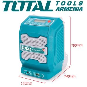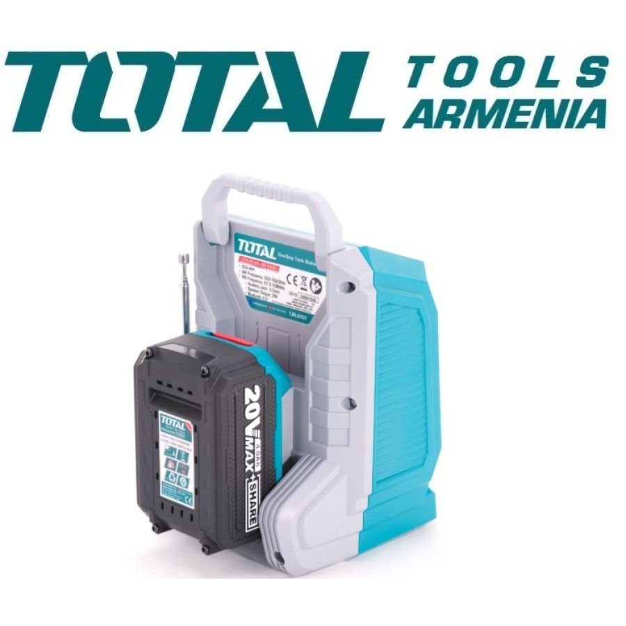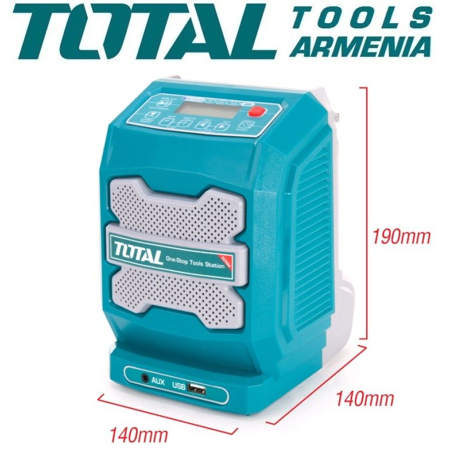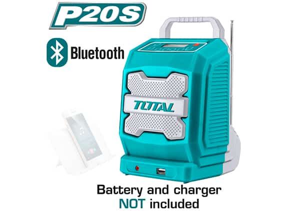 Литий-ионная рабочая радиостанция TOTAL TJRLI2001 Тип - рабочее радио. Напряжение - 20В. Частота АМ - 522-1620 кГц. Частота FM - 87,5-108 МГц. Вспомогательный разъем - 3,5 мм. Мощность динамика - 3Вт. Bluetooth - 4.0. Порт зарядки - USB. Аккумулятор и зарядное устройство - в комплект не входят. Вес - 1кг. Упаковано в картонную коробку. Радиоприемник отличается наличием интерфейса Bluetooth, что дает возможность слушать музыку со смартфона или планшета без использования проводов. Для удобства использования настройки каналов AM / FM сохранены. Длительный срок службы обеспечивается пыленепроницаемым, брызгозащищенным и ударопрочным корпусом.