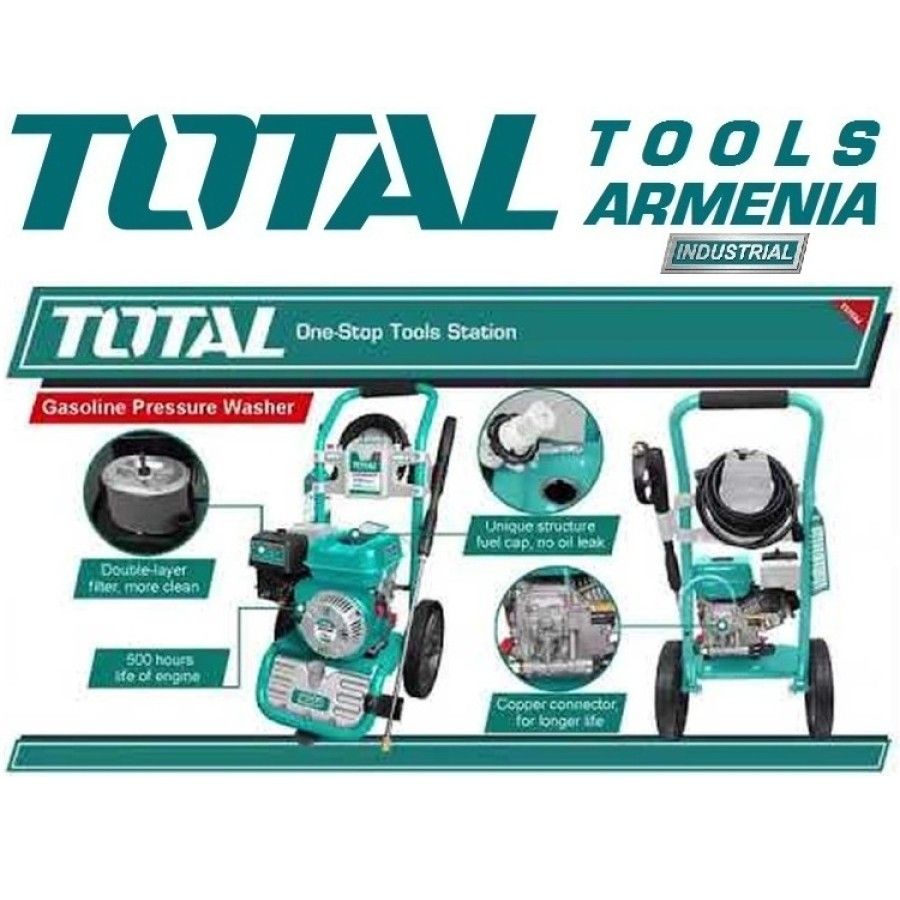 Мойка высокого давления ( С бензиновым двигателем ) TOTALTGT250105 6 л.с. Мойка – аппарат высокого давления для удаления загрязнений, оснащенный механизмом всасывания моющего средства, с бензиновым двигателем. Мойка высокого давления инструмент, предназначенный для очистки поверхностей мощной струёй воды от различного рода загрязнений, продуктов коррозии и старых покрытий: краски, лаков, плесени и т. п. Мощность:6 л.с. Тип насоса: 3-поршневой аксиально-кулачковый насос-алюминий. Тип двигателя: 4-тактный OHV. Обороты двигателя : 3600 об / мин. Объем двигателя: 208 см ³ . Номинальное давление: 214 бар. (3100 фунтов на квадратный дюйм) Система запуска: ручная. Расход воды: 522 л / час. Объем топлива: 3,6 л. Объем масла: 0,6 л . Тип топлива: бензин. Бачок для моющего средства: 1 шт. Пистолет метал. для подачи воды:1 шт. Шланг высокого давления - 7.6 м и 3 форсунки . Ручка для переноски - фиксированная. Наличие транспортных колес - да. Вес: 31 кг. Гарантия: 1 Года.