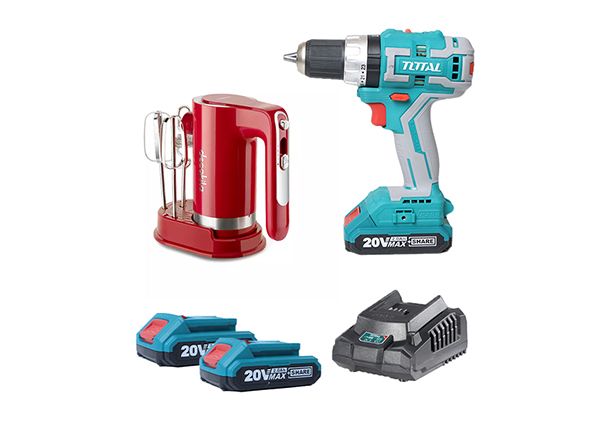 Литий-ионный комплект 2шт TOTAL TOSLI23062 Литий-ионная дрель-шуруповёрт ( TIDLI20608 ) Бесщеточный двигатель Напряжение: 20 В Напряжение зарядки: 220-240 В~50/60 Гц Максимальная скорость: 0-450/0-1900 об/мин. Максимальный крутящий момент: 60 Нм Размер патрона: 2–13 мм. Настройка крутящего момента: 23+1+1 Безключевой патрон Механическая 2-ступенчатая коробка передач 2 аккумулятора 2,0 Ач 1 зарядное устройство Ручной беспроводной миксер (KMMX006R) Мощность: 90 Вт Напряжение: 11,1 В постоянного тока Объем аккумулятора: 2000 мАч 7-ступенчатая С контролем скорости С индивидуальной кнопкой извлечения С гибким рукавом для шнура Напряжение заряда: 220-240 В~50/60 Гц Встроенный рабочий свет Светодиодный индикатор заряда батареи В комплекте: С 2 аккумуляторами емкостью 2,0 Ач ( TFBLI20011 ) С зарядным устройством 1 шт. ( TFCLI2001 ) С аксессуарами 50 шт. С 2 гибкими рукавами для шнура С 2 крючками для венчиков. С вспенивателем молока 1 шт. С отдельной подставкой для удобства хранения. С функцией хранения Упаковано в цветную коробку