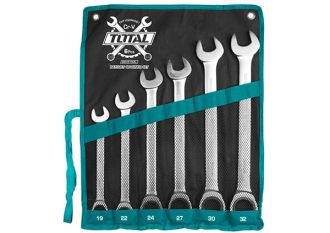 Набор гаечных ключей комбинированных с трещоткой 6шт. TOTAL THT102RK061 Размер мин. 19мм Размер макс. 32мм Тип комбинированные Материал Хром-Ванадий Cr-V Количество в наборе 6шт. Форма прямой Размеры ключей 19мм, 22 мм, 24 мм, 27 мм, 30 мм, 32 мм, Набор гаечных ключей комбинированных с трещоткой 6шт. насчитывает 6 комбинированных гаечных ключей с накидными и рожковыми головками размером 19мм, 22мм, 24мм, 27мм, 30мм, 32мм. Все ключи изготовлены из высокопрочного хром-ванадиевой сплава и отлично отполированы. Для удобства хранения и транспортировки ключи поставляются в чехле из ткани.