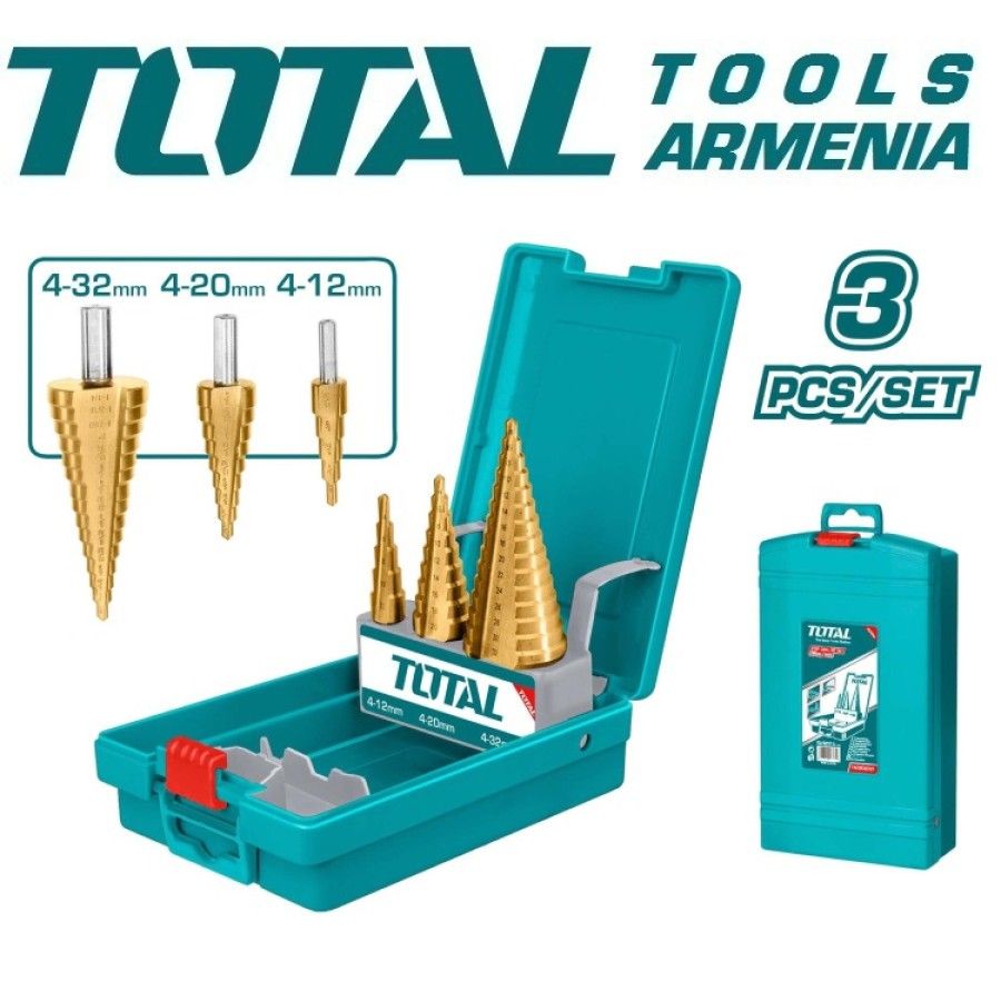 В комплектации:Набор ступенчатых сверл из 3 предметов 1шт 4-12мм, 1мм/шаг, диаметр соединения: 6мм 1шт 4-20мм, 2мм/шаг, диаметр соединения: 8мм 1шт 4-32мм, 2мм/шаг, диаметр соединения: 10мм