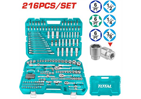 Набор кривошипов 216 шт. TOTAL THKTHP22166 14 шт. 1/2" шестигранная головка: 10-11-12-13-14-15-17-19-21-22-24-27-30-32мм. 5 шт. 1/4 "звездочка: E4-E5-E6-E7-E8. 6шт 3/8" звездочка: E10-E11-E12-E14-E16-E18. 3 шт. 1/2 "звездочка: E20-E22-E24. 7шт 1/4" шестигранник: 4-5-6-7-8-9-10мм. Шестигранная головка 3/8" 6 шт.: 10-11-12-13-14-15 мм. 5 шт. шестигранных головок 1/2": 16-17-18-19-22 мм. 1 х 1/2 "восковая головка: 21 мм. 2 x 3/8" восковых головки, 16 мм и 18 мм. 1 х 1/4 "Т-образная отвертка. 2 удлинителя 1/4 дюйма: 50 мм (2 дюйма) и 100 мм (4 дюйма). 1 тройной адаптер 1/4 дюйма: 3/8 дюйма (F) * 1/4 дюйма (M). 1 удлинитель 3/8 дюйма: 150 мм (6 дюймов). 1 тройной адаптер 3/8 дюйма: 1/4 дюйма (F) x 3/8 (M). 2 удлинителя 1/2 дюйма: 125 мм (5 дюймов) и 250 мм (10 дюймов) 1 x 1/2 "трехходовой адаптер: 3/8" (F) x 1/2 (M). 3 Др. Универсальный разъем: 1/4 "и 3/8" и 1/2". 1 шт. магнитная ручка: 1/4 "* 150 мм. 1 шт. магнитный штифт: 6,35 мм * 100 мм. 3 держателя бит: 1/4 "* 6,35 мм и 3/8" * 8 мм и 1/2 "* 8 мм. 40 бит 6,35*25 мм (L): T5-T6-T7-T8-T9-T10-T15-T20-T25-T30-PH1-PH2-PH2-PH3-PH4-PZ1-PZ2-PZ2-PZ3 -PZ4- SL3-SL3-SL4-SL4-SL5-SL5.5-SL6-SL6.5-SL7-SL7-H2-H3-H3-H4-H4-H5-H5-H6-H7-H7. 32 шт. 8x30 мм (L) Биты: PH3-PH4-PZ3-PZ4-H7-H8-H10-H12-H14-SL5-SL6-SL6.5-SL8-T20-T25-T27-T30-T35-T40-T45 -T50 -T55-T27H-T30H-T35H-T40H--T45H-T50H-M5-M6-M8-M10. 30 шт. 1/4 "x 32 мм (Д) Биты: PH1-PH2-PH3-PZ1-PZ2-PZ3-H3-H4-H5-H6-SL4-SL5.5-SL6.5-SL8-T8-T9-T10 - T15 -T20-T25-T27-T30-T8H-T9H-T10H-T15H-T20H-T25H-T27H-T30H. 2 шт. 1/2 "x 58 мм (Д) Биты: T55-T60. 12 комбинированных роликов: 8-10-11-12-13-14-15-16-17-18-19-22 мм. 8 шестигранных ключей: 1,5-2-2,5-3-4-5-5,5-6 мм.