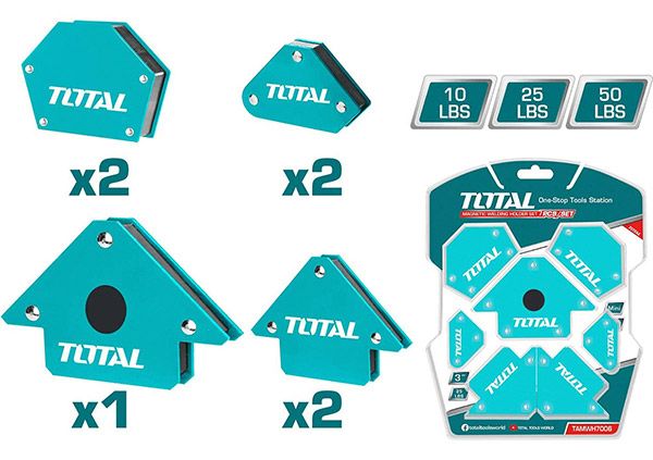 Набор магнитных сварочных держателей 7шт. TOTAL TAMWH7006 Тип - набор сварочных держателей. В комплекте - 2 держателя 3 дюйма, 2 мини магнита, 2 держателя 3 дюйма 6 углов, 1 магнит 4 дюйма. Материал - магнит и сталь. Углы - 30°, 45°, 75°, 90°, 105°, 120°, 135°. Тяговое усилие 25 фунтов, 10 фунтов, 50 фунтов. Упаковано двойным блистером. Мощные уголки для магнитной сварки, держатели для панелей, труб или других свариваемых деталей. Позволяет точно совмещать углы в процессе сварки, монтажа металлоконструкций. Магнитный сварочный аппарат - вторая рука сварщика. Больше не нужно обращаться за помощью - благодаря приспособлению для магнитной сварки - весь процесс может выполнять один рабочий, что значительно упрощает процесс изготовления необходимой конструкции.