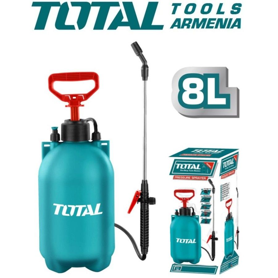 Напорный опрыскиватель 8 литров TOTAL THSPP3081 Емкость 8 литров Предохранительный клапан сброса давления Удобный ремень для переноски Давление 2,5 бар гибкий шланг длиной 1,2 м Триггер ВКЛ/ВЫКЛ с блокировкой триггера Регулируемый спрей Упаковано в цветную коробку Ручной опрыскиватель используется при работе в саду. Полезен для распыления жидких удобрений и щадящего орошения растений. Опрыскиватель имеет широкое горлышко для удобного заполнения бака. Наличие плечевого ремня позволяет легко переносить изделие.