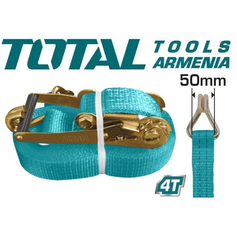 Ремень с трещоткой 4Tx10м TOTAL THTRS4101 Ширина лямки 50мм. Материал полиэстер. Длина 10м. Вес 2.2 кг. Максимальная сила 4000 кг (4 тонны). С трещоткой и двойными J-образными крючками.