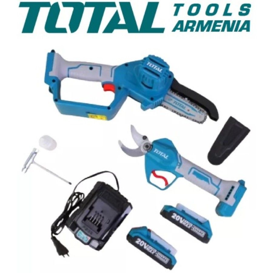 Секатор и мини-пила 20 В набор TOTAL TOSLI23012 Ножницы для обрезки: TSSLI20308 Бесщеточный двигатель. Напряжение: 20В. Диаметр резки: 20 - 30 мм․ Мини-пила: TGSLI2058 Длина: 13 см. Скорость цепи: 5 м/с. В комплект входят: аккумуляторы 2x 2.0Ah, 1x зарядное устройство, 1x пильная цепь, 1x бутылка для смешивания, 1x точильный камень, 1x линейка для пил. Упакован в красочную коробку.